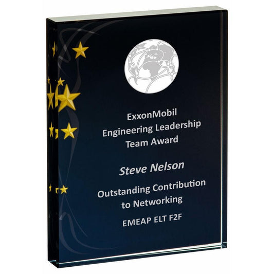 Rectangular Glass Award - Black Background with Gold Stars - Personalisable Engraving - Available in 2 Sizes