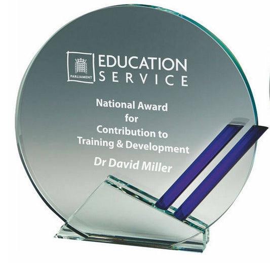 Clear Glass Round Award with Blue Trim - 12mm Thickness. Personalised Laser Engraving and Presentation CaseRegular price From £32.00Regular priceUnit price per-