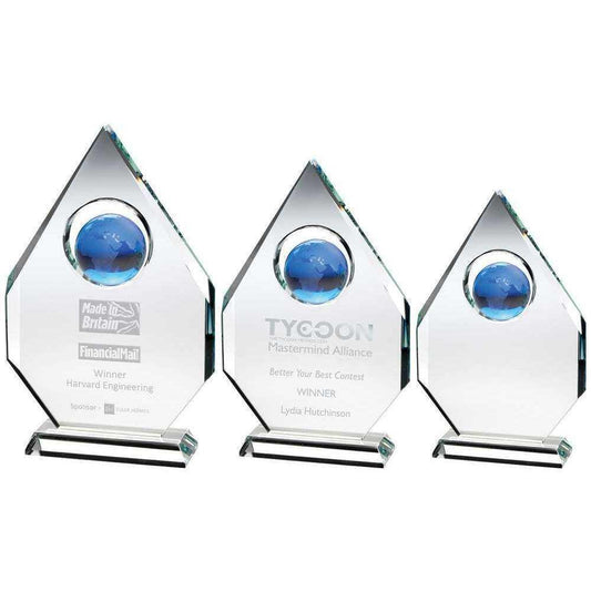 Clear Glass Diamond Plaque With Blue Globe - Personalisable Engraving