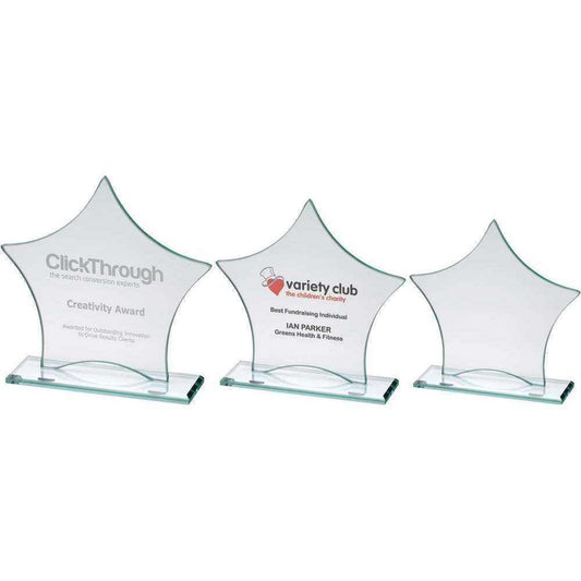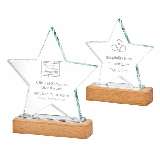 Star Glass Stand Award with Wooden Base - Available in 2 Sizes