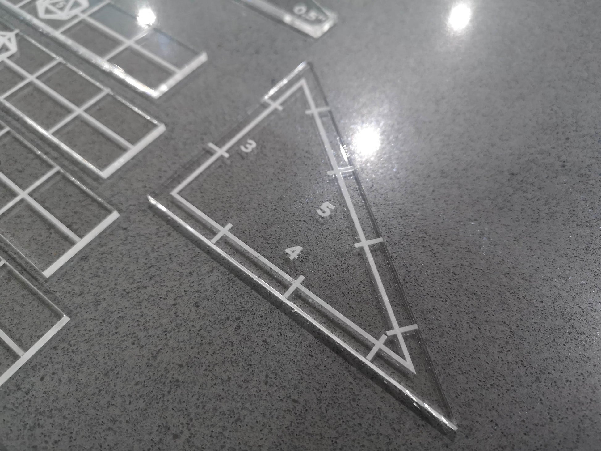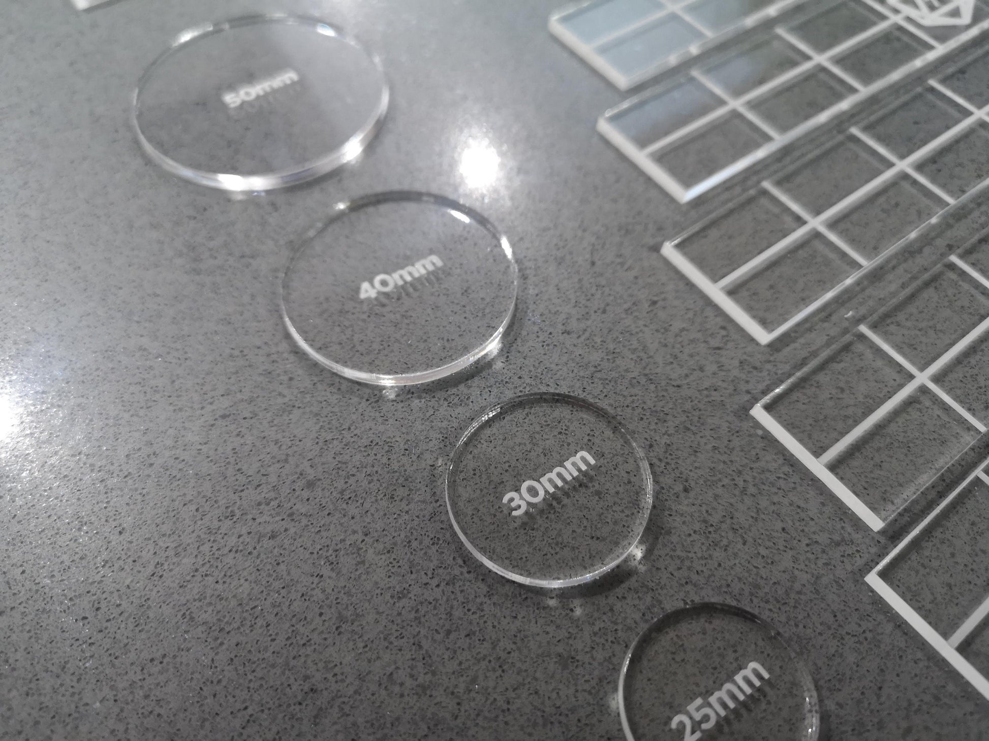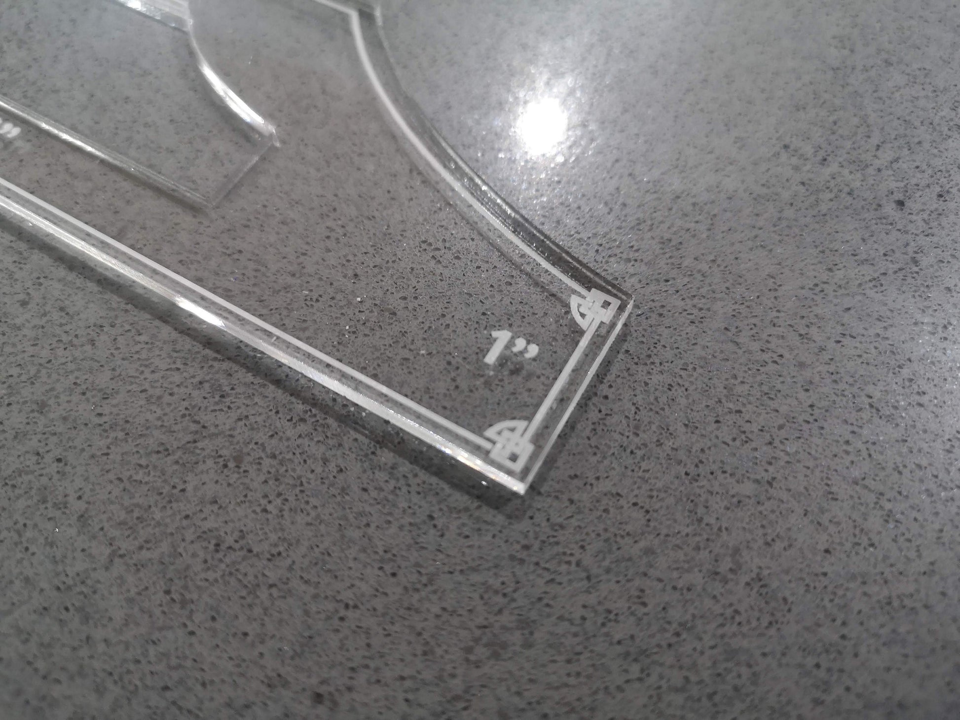 The rulers, widgets and gauges are all laser engraved and then laser cut. The engraving on the Clear and Black acrylics have a great colour contrast and are easy to see from a distance.