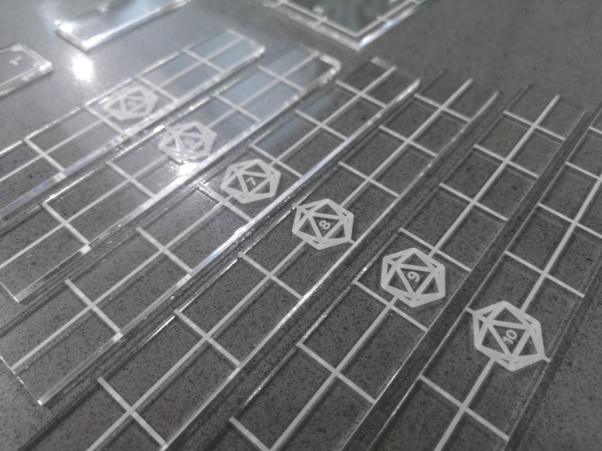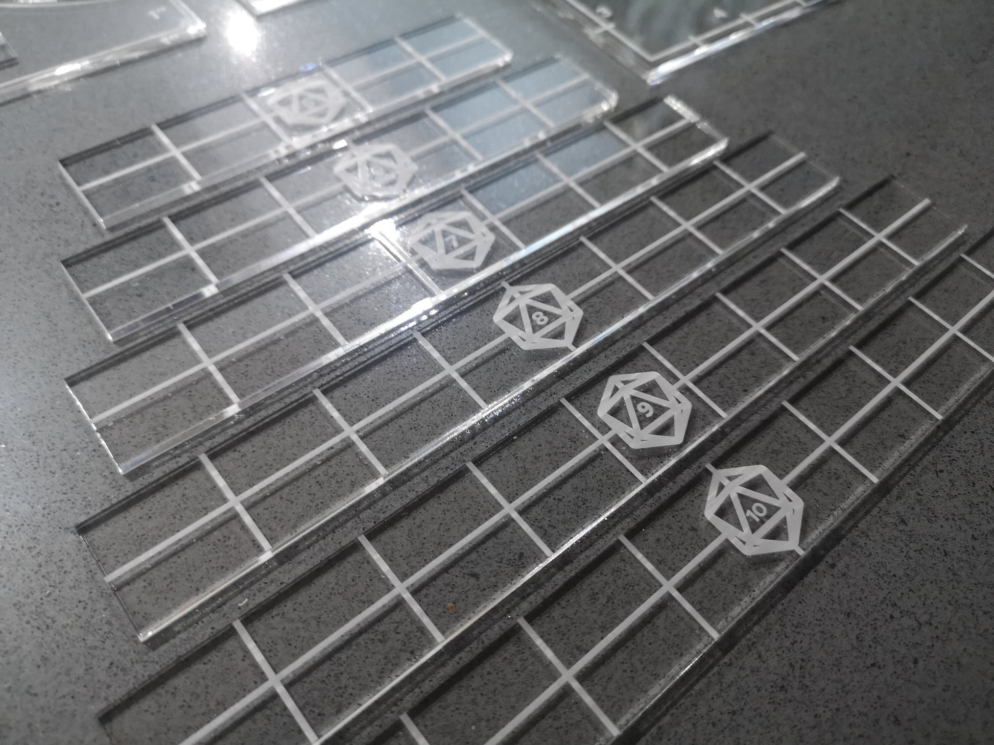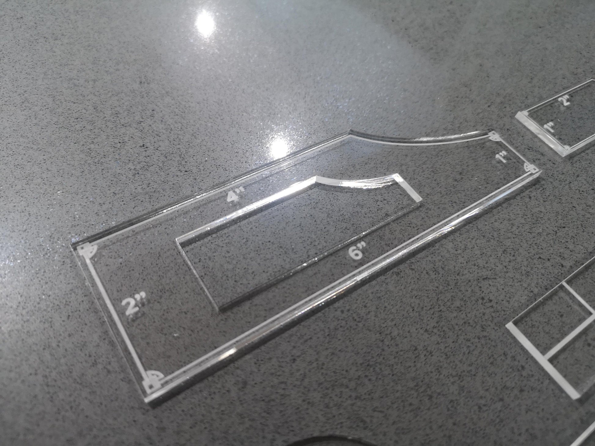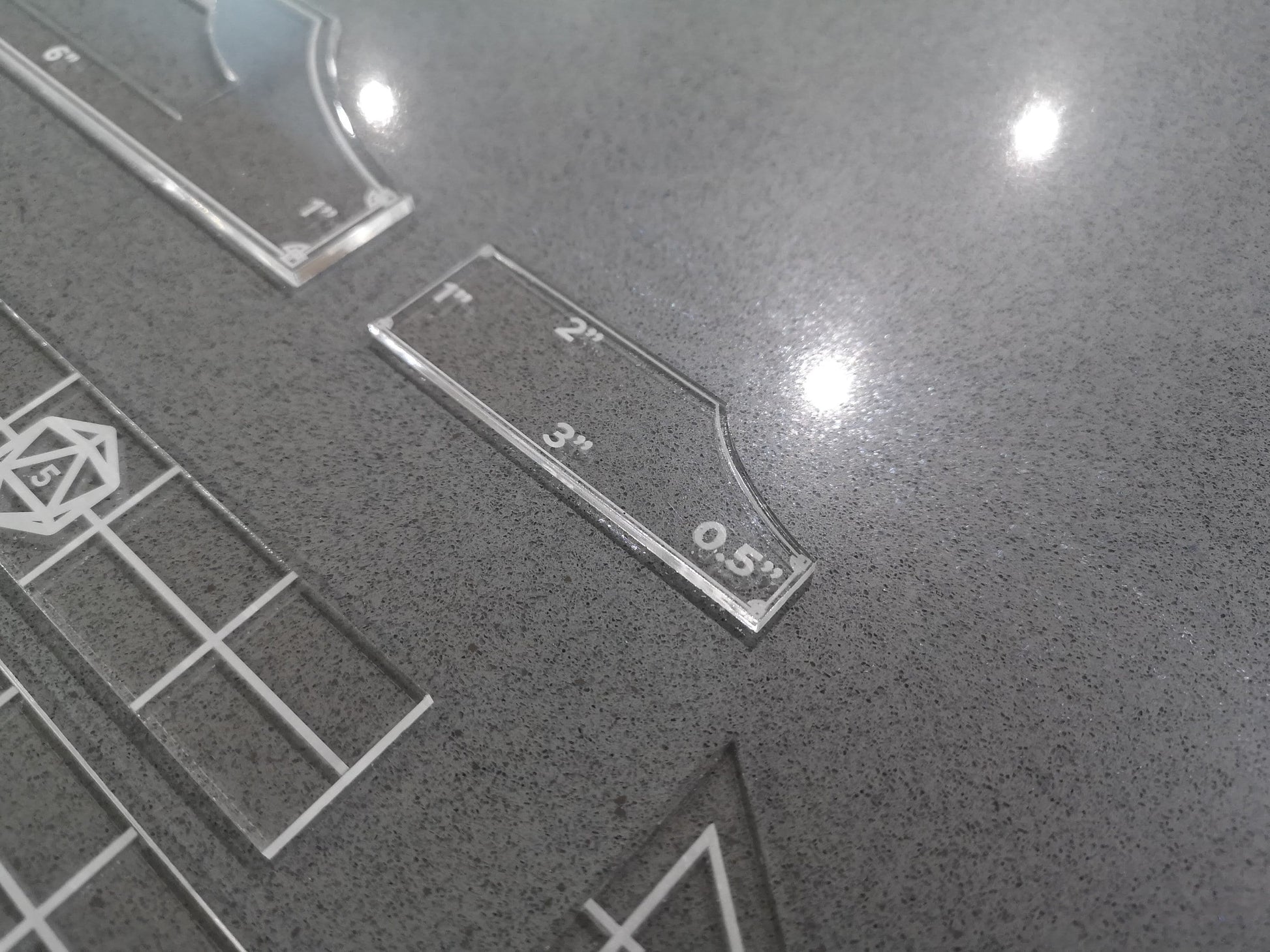 The rulers, widgets and gauges are all laser engraved and then laser cut. The engraving on the Clear and Black acrylics have a great colour contrast and are easy to see from a distance.