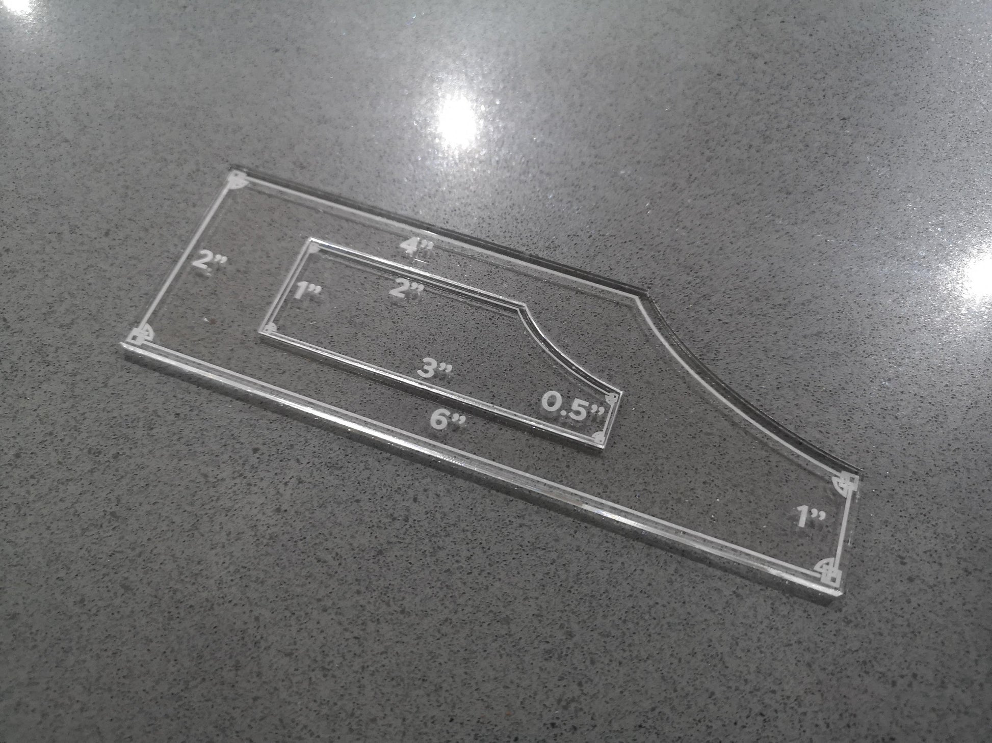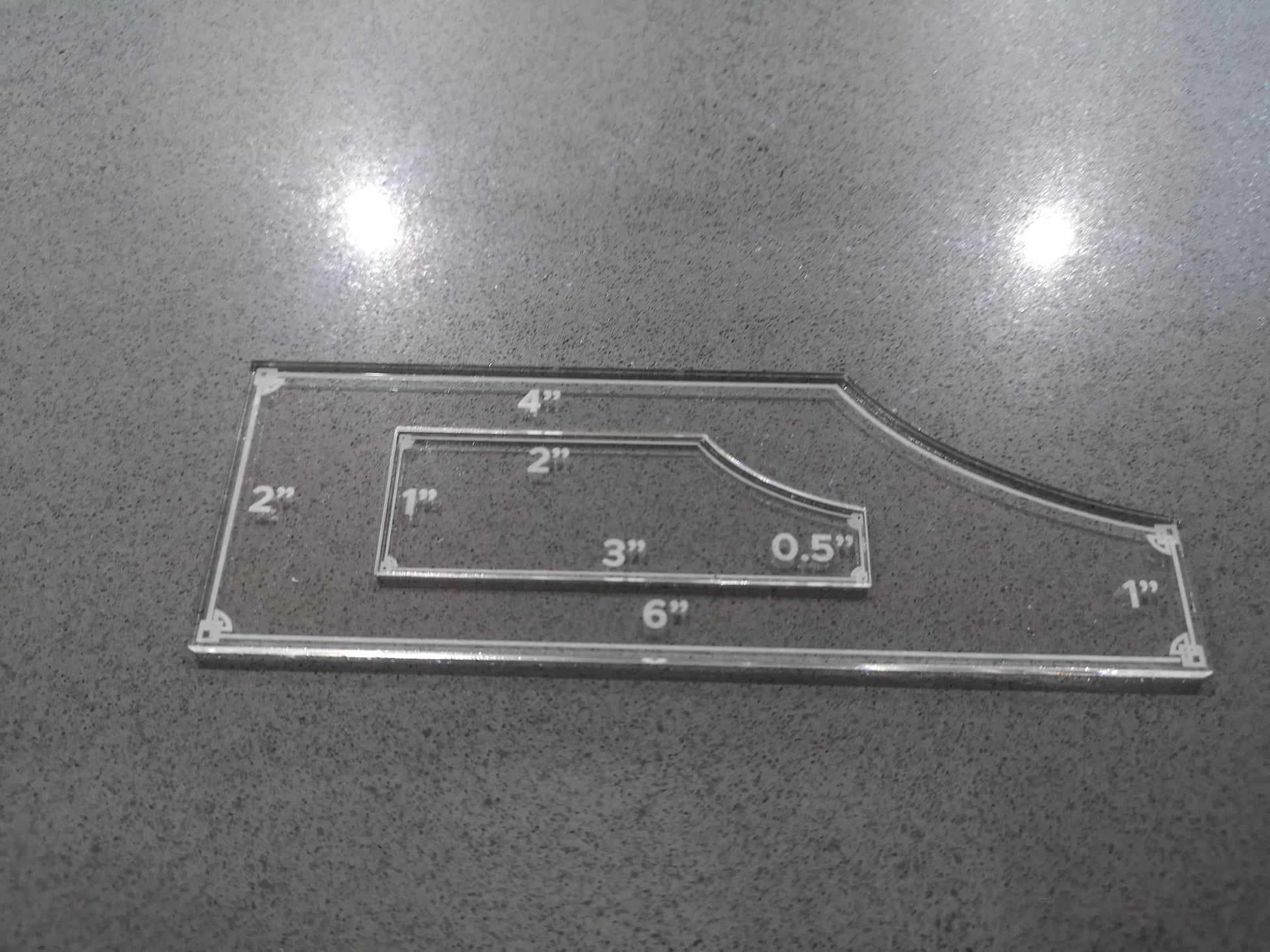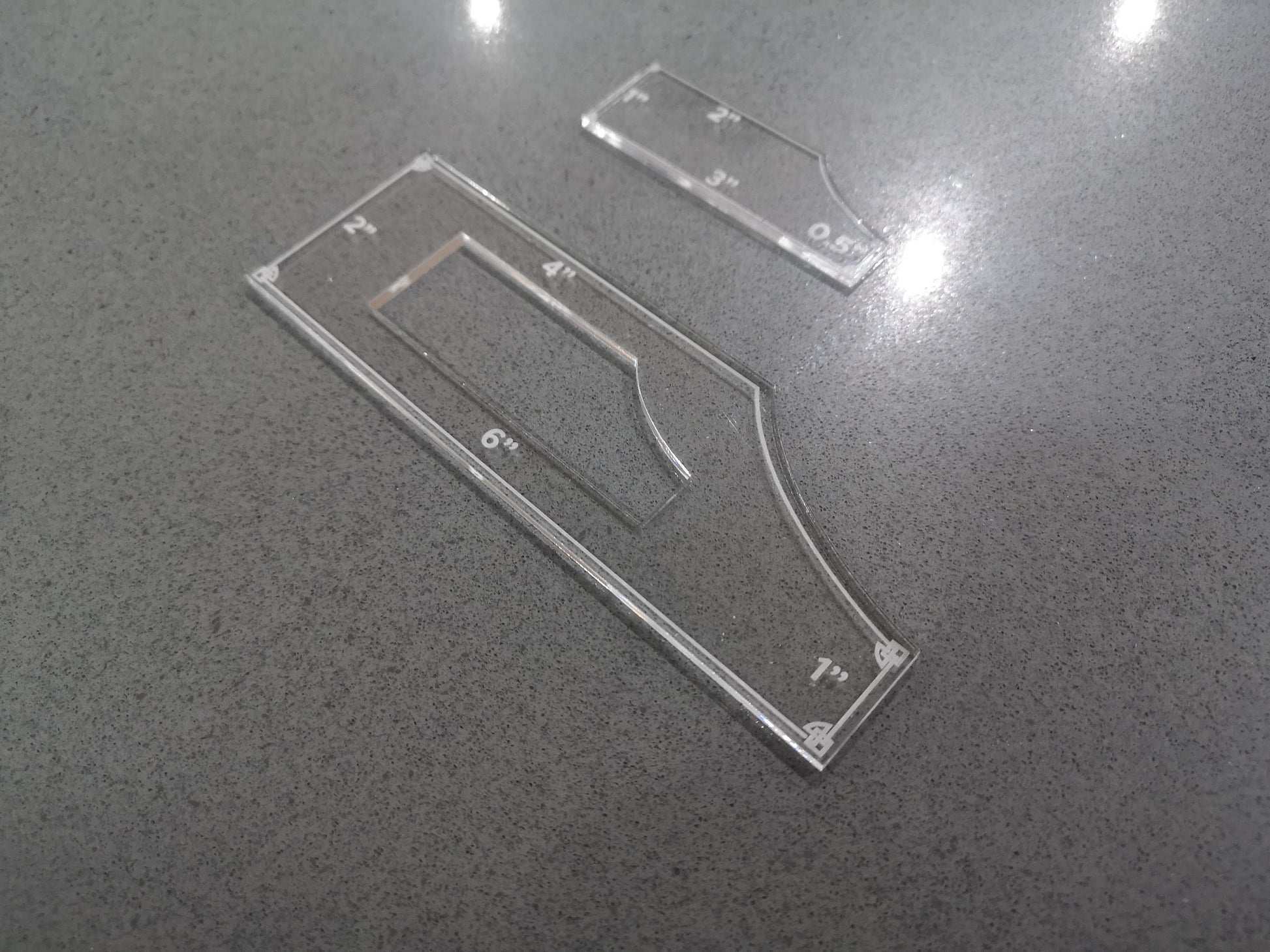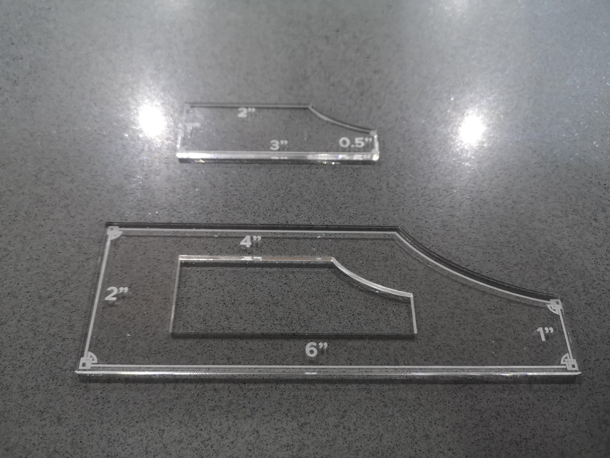 This set of 2 measurement gauges has 1 widget with sides at 3", 2", 1" and 0.5", and the second with sides 6", 4", 2" and 1".