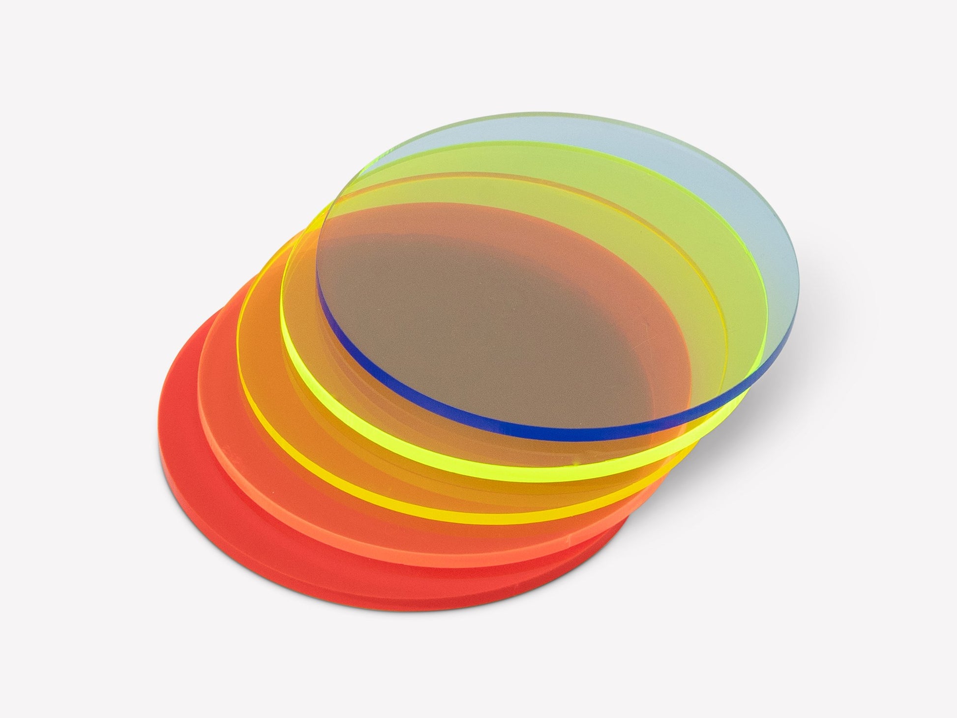 This listing is for a set of 10, 3mm thick acrylic fluorescent circle discs, with you option of 10mm-250mm diameter. These are available in blue, red, orange, yellow and green.
