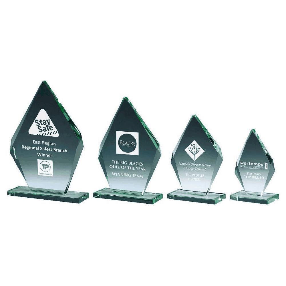 This listing is for a Beveled Jade Glass Diamond Stand Award, available in 4 sizes (13.5cm, 16.5cm, 19.5cm, 22.5cm). Each award is 8mm thick glass and comes in a cardboard box with protective packaging.