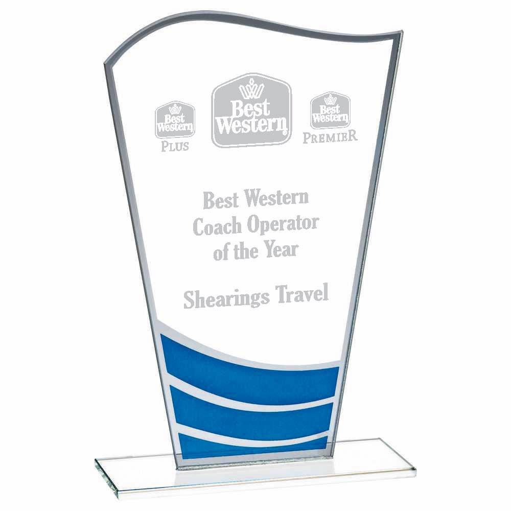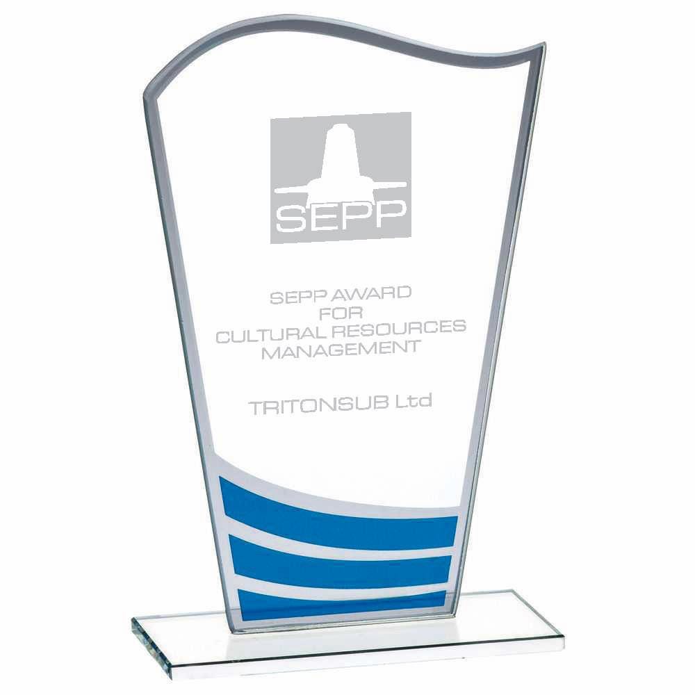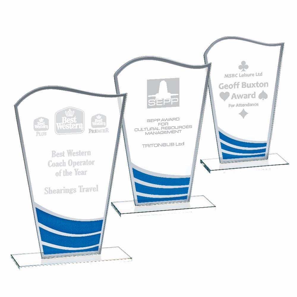 This listing is for a Clear Blue Wave Glass Award, available in 3 sizes (16cm, 18cm, 20cm). Each award is 4mm thick glass and comes in a cardboard box with protective packaging.