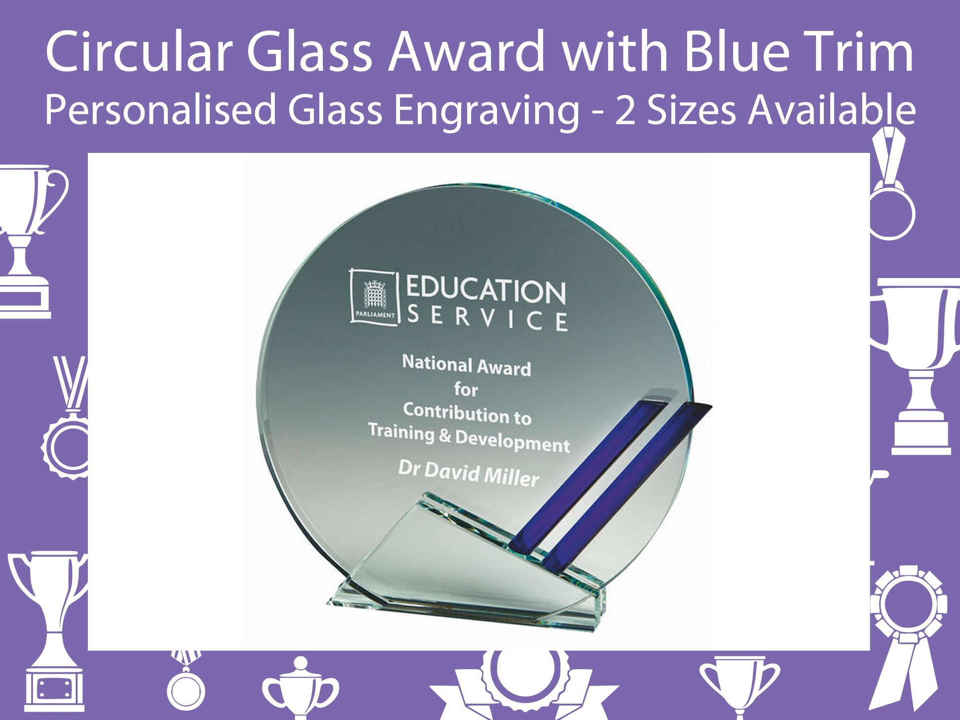 Clear Glass Round Award with Blue Trim - 12mm Thickness. Personalised Laser Engraving and Presentation Case
