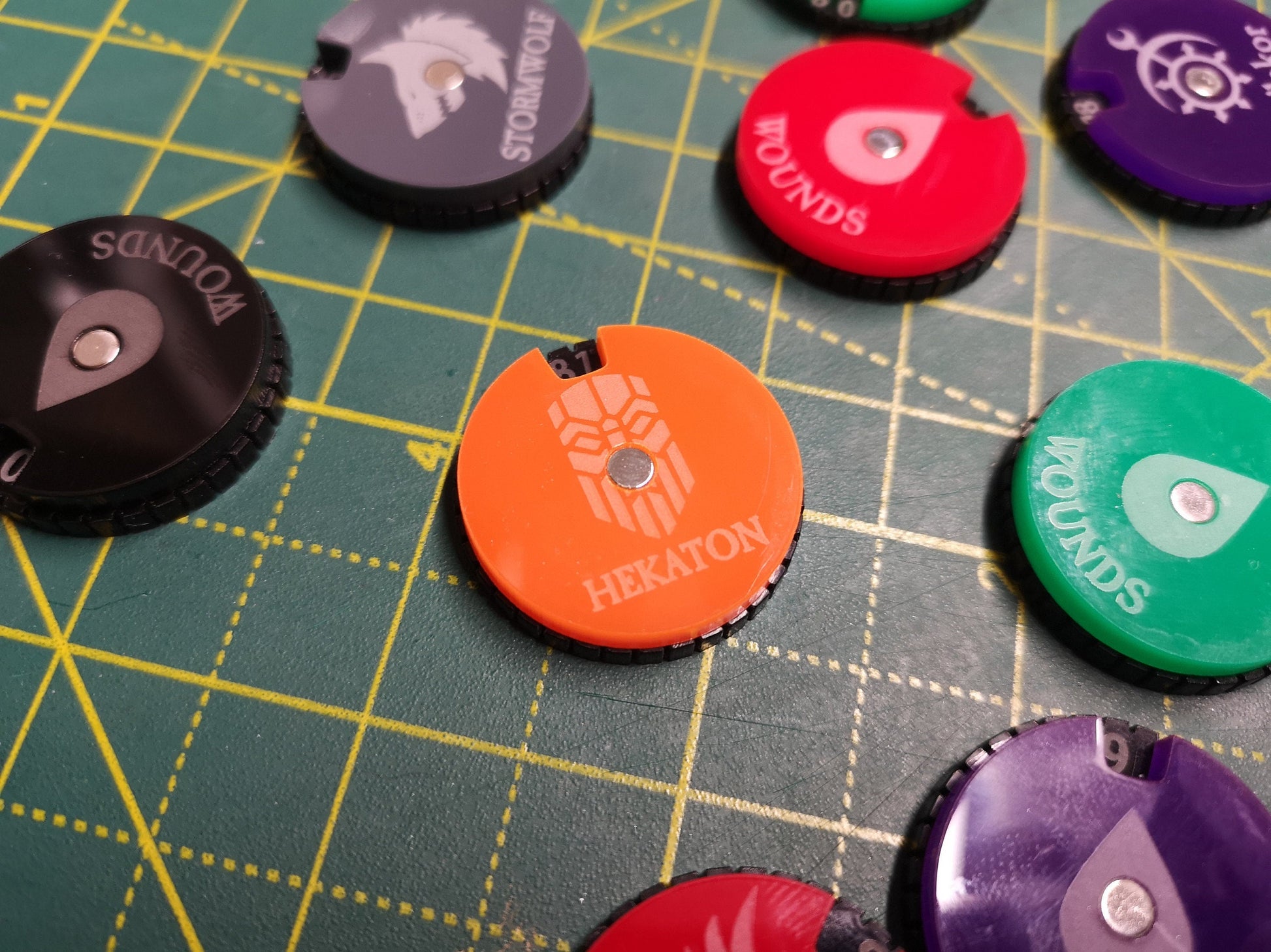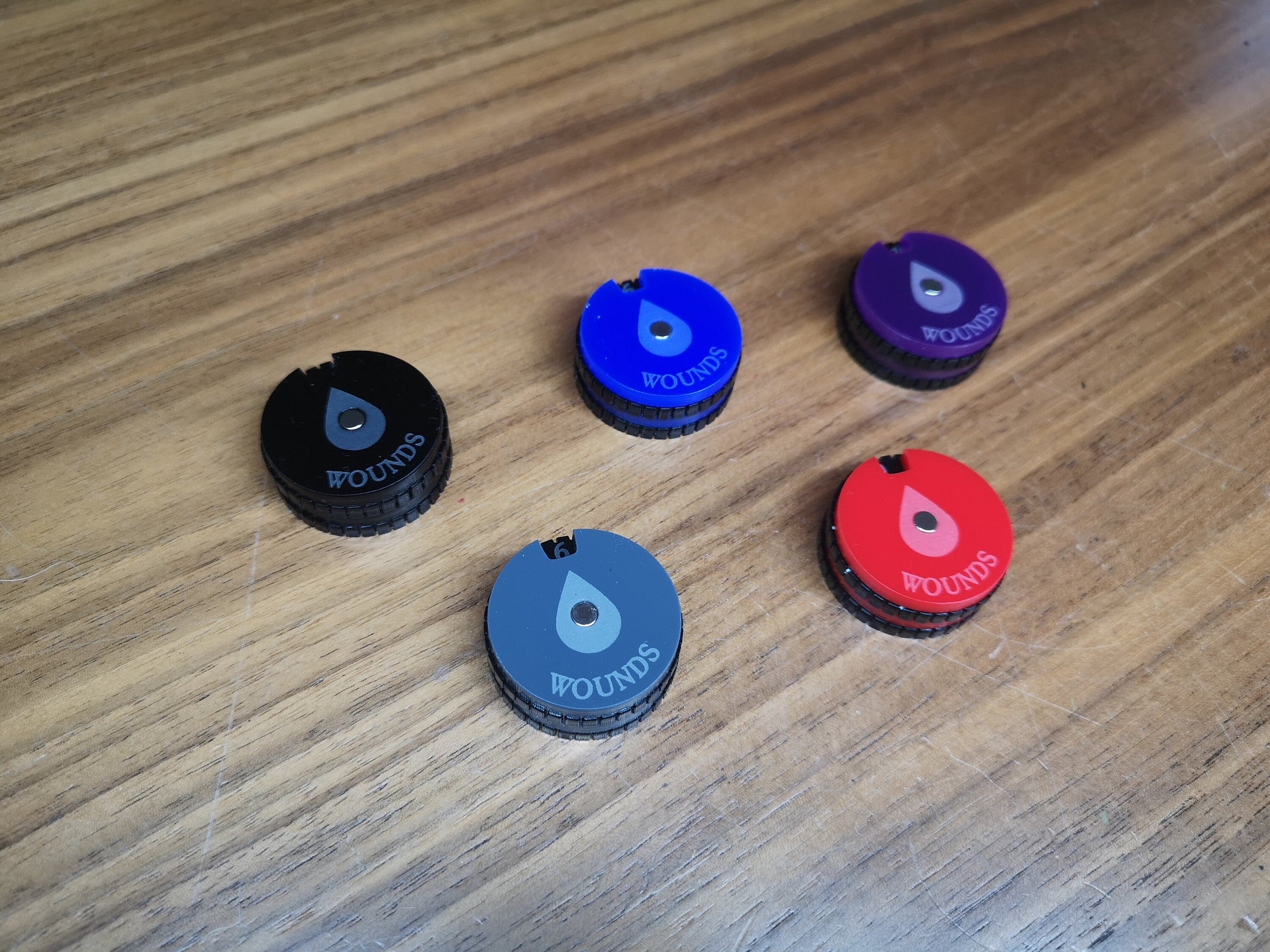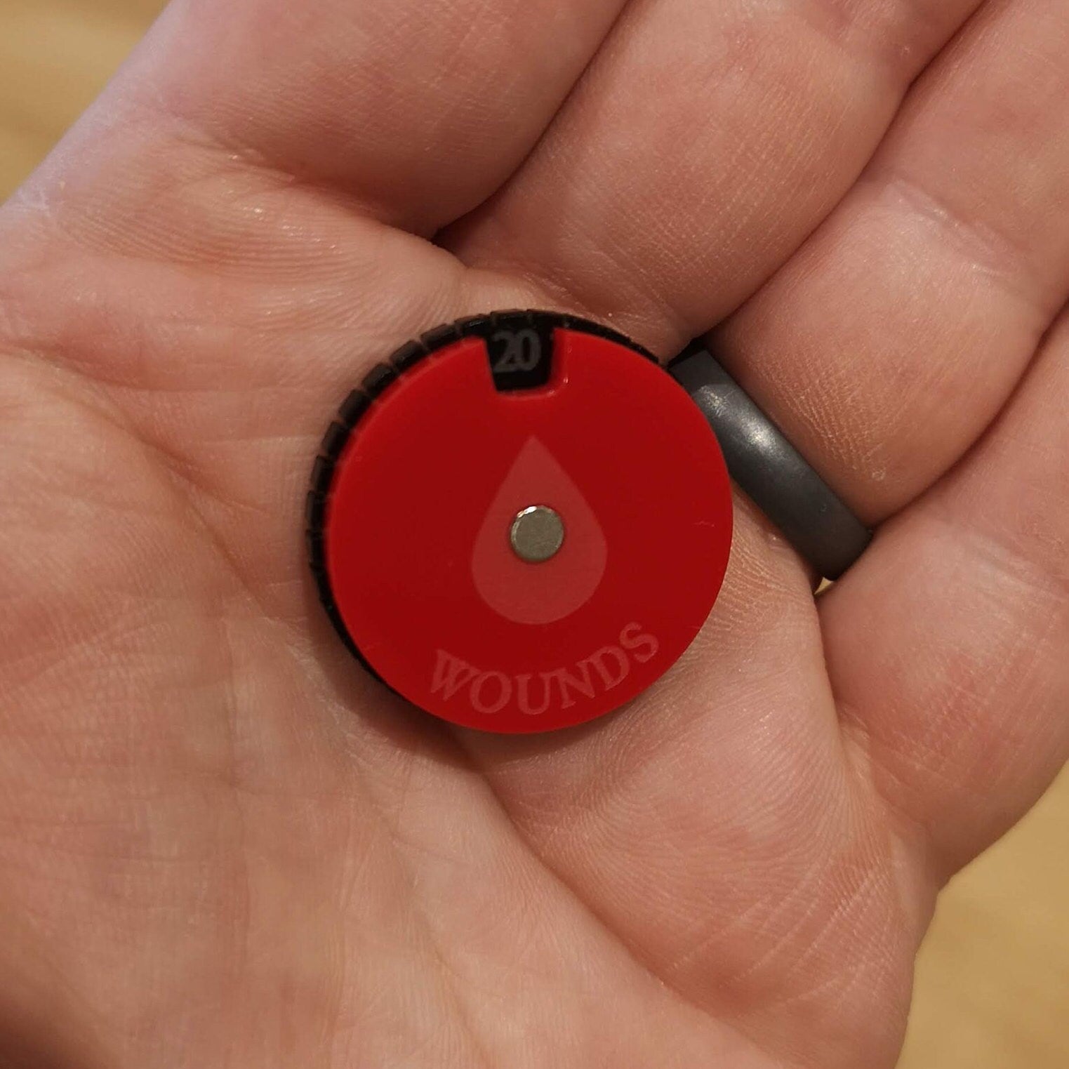 This 30mm diameter tracker tracks wounds 0-20. Measuring at 30mm diameter the base dial is black 3mm thick acrylic with the numbers engraved, the top layer is a colour of your choosing. The layers are then attached with magnets.