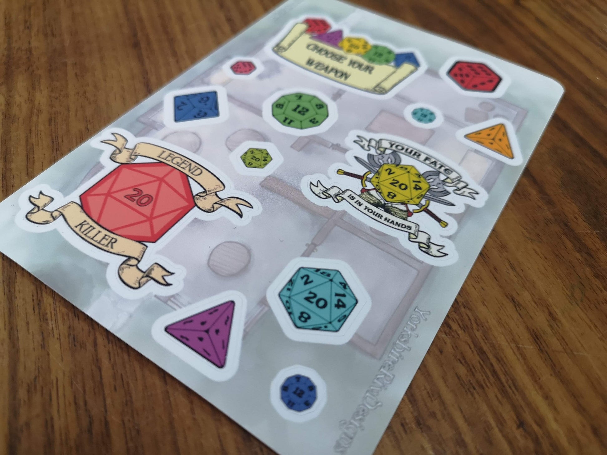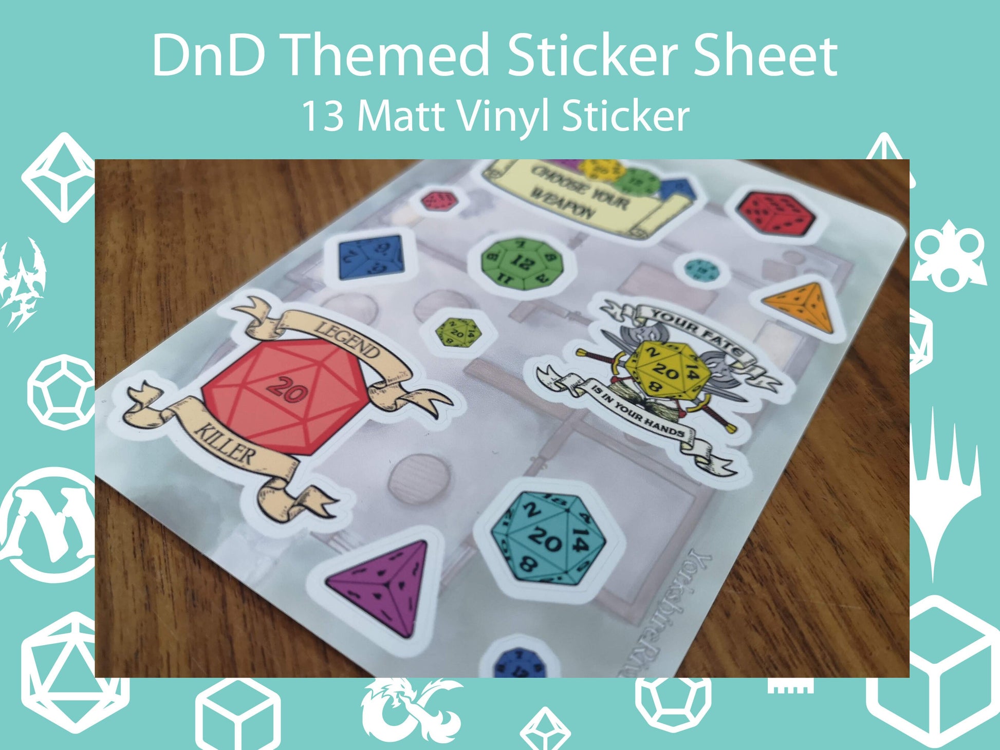 Dungeons and Dragons Themed Matt Vinyl Sticker Sheet - 3 Large DnD themed Stickers and 10 Dice Stickers