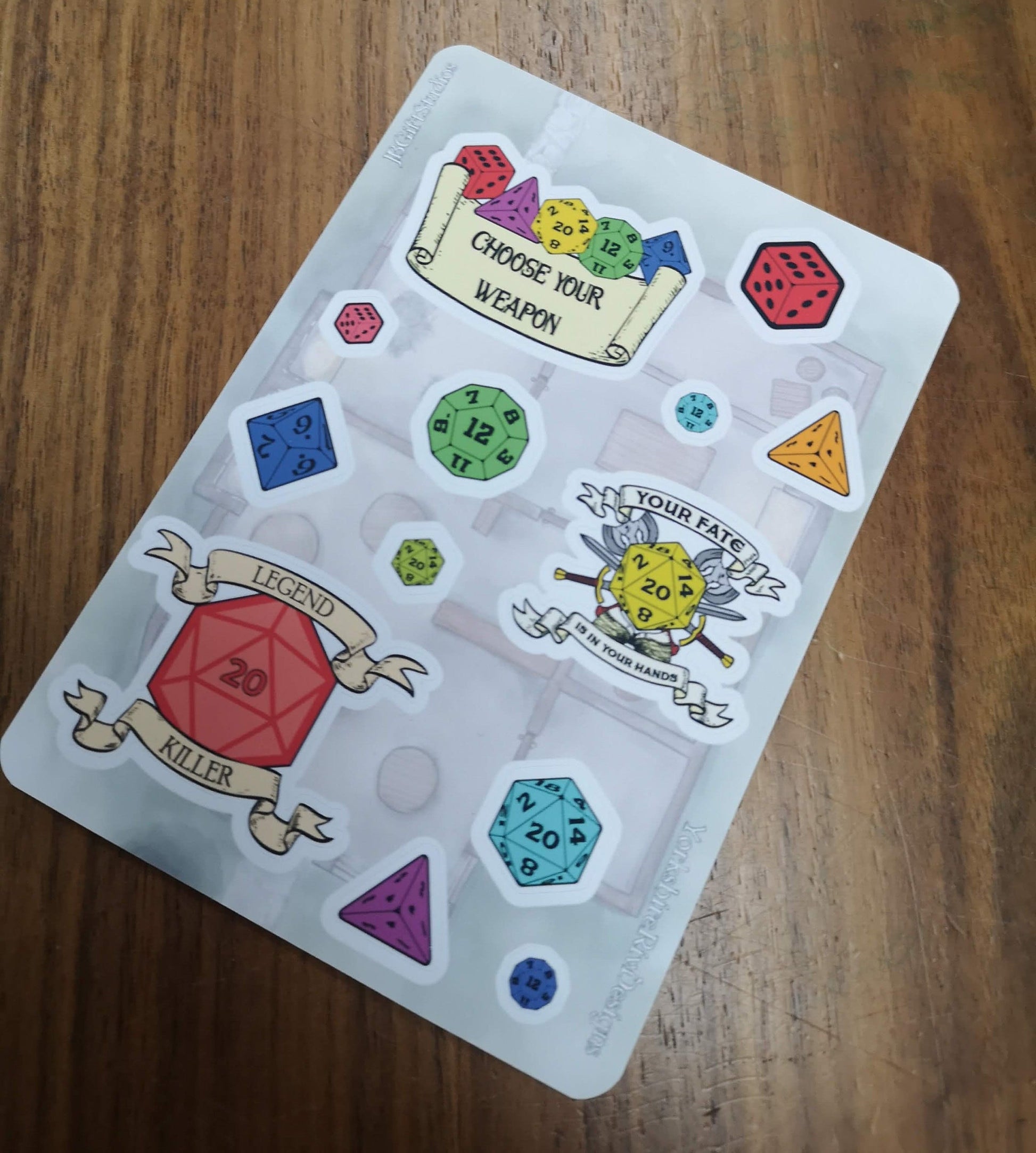 This listing is for one sheet of stickers with 3 large DnD themed designs and 10 smaller dice stickers.