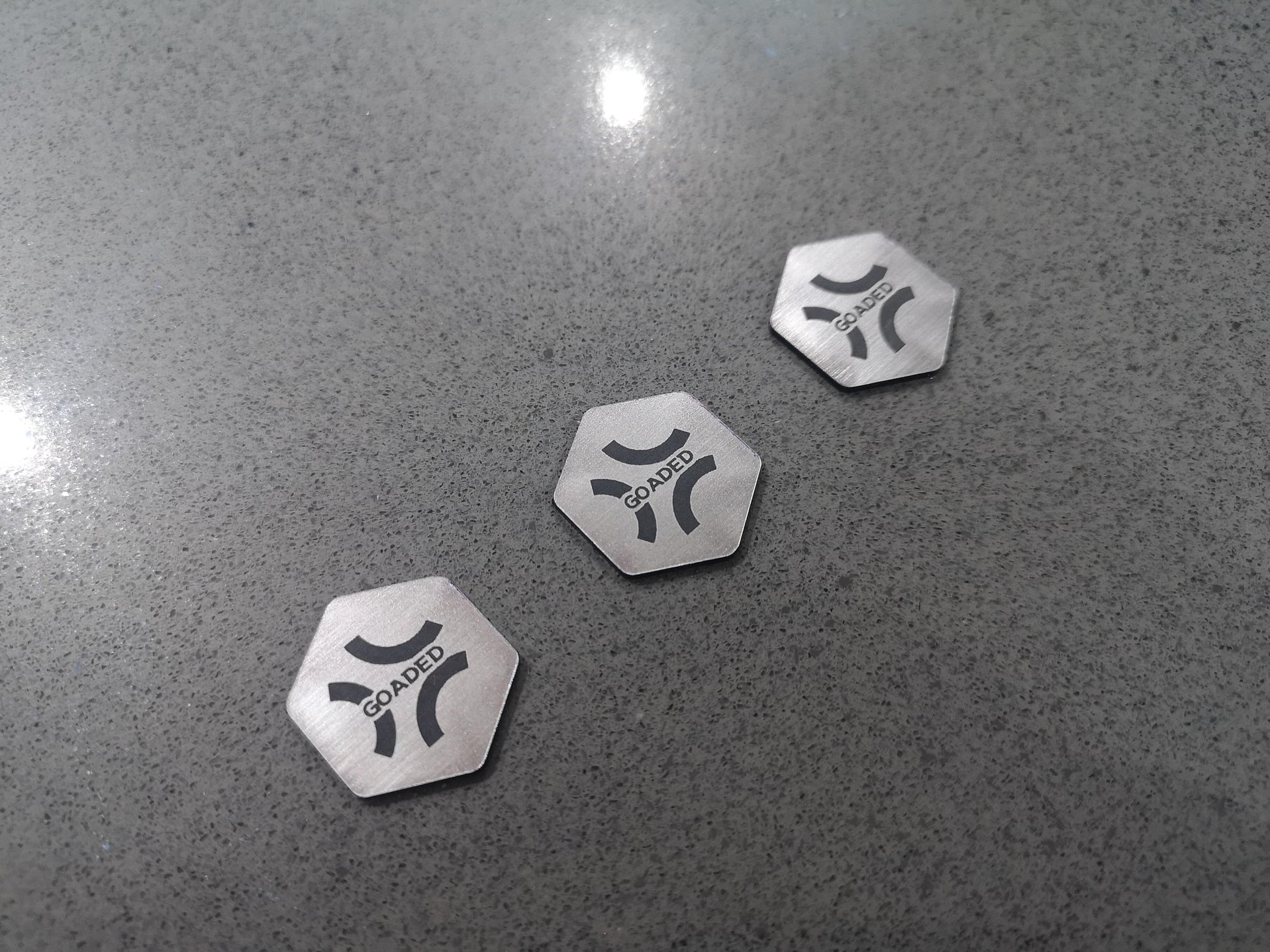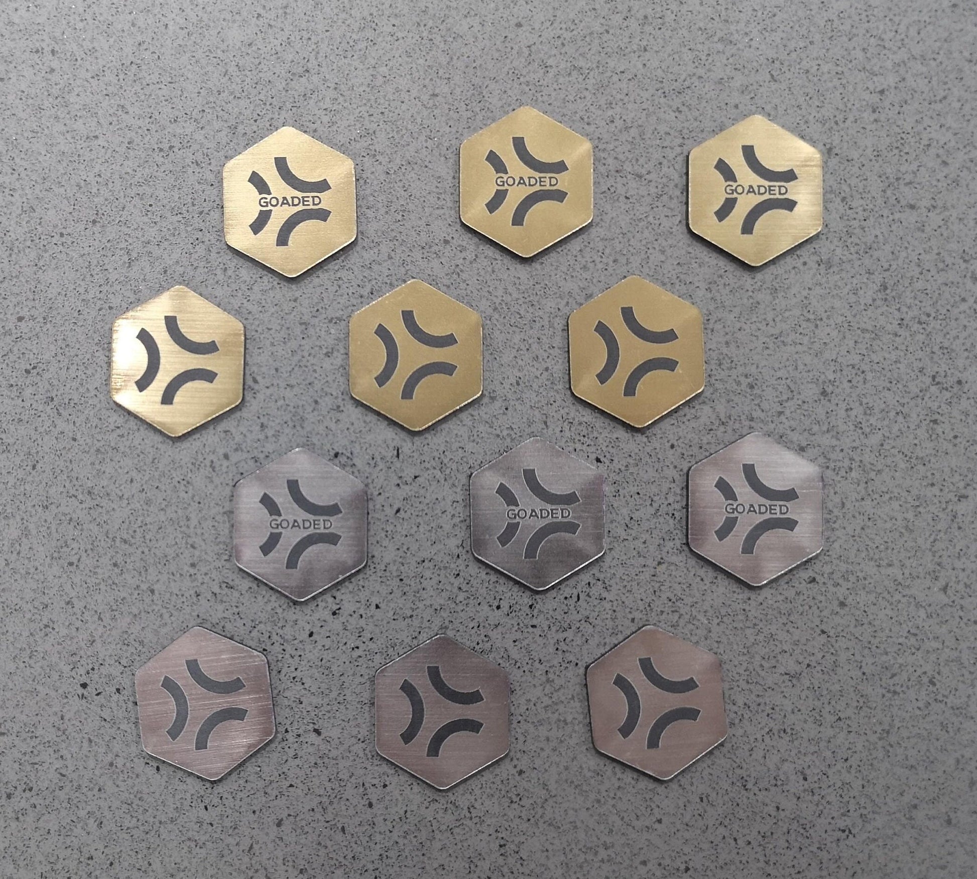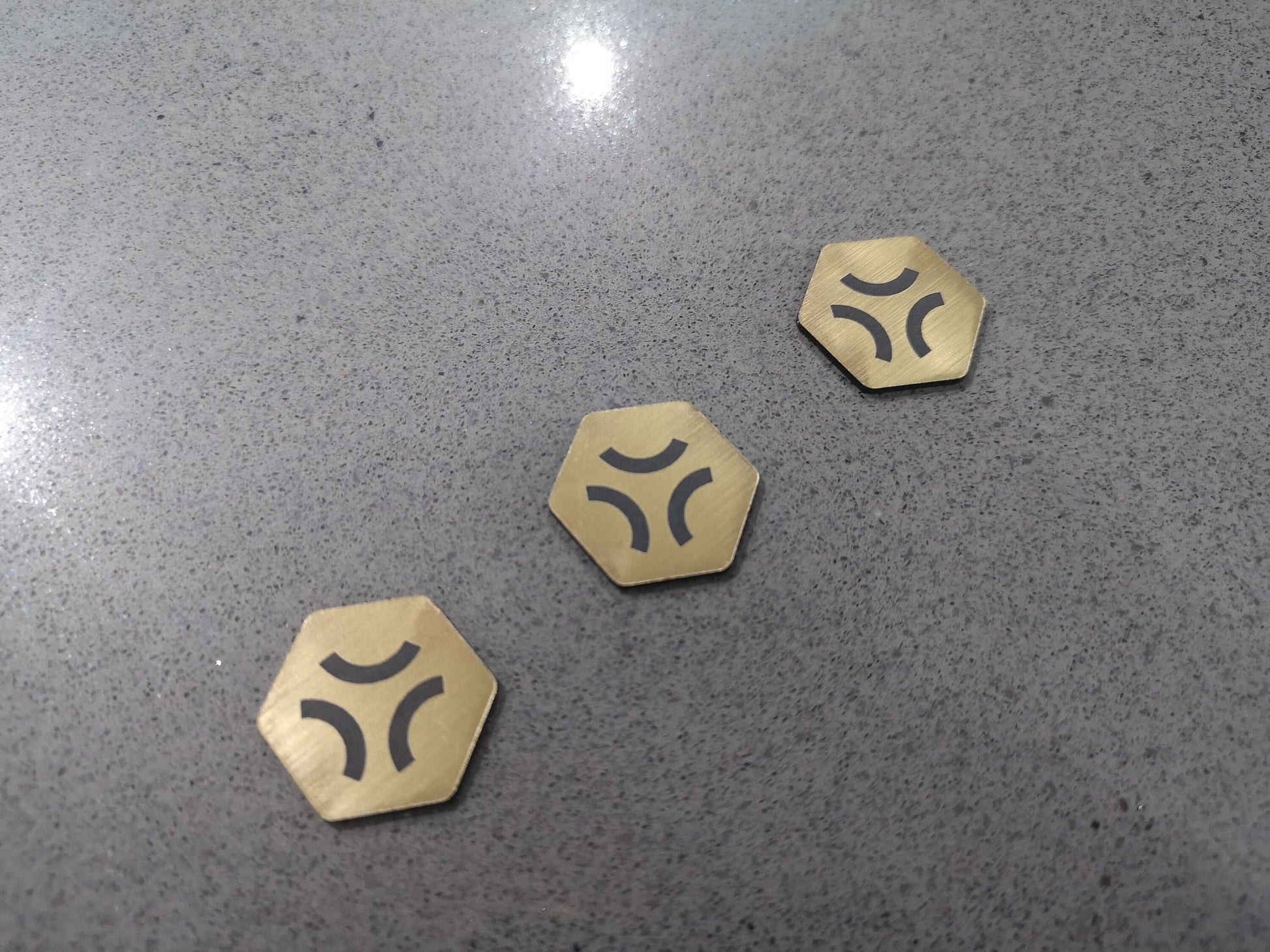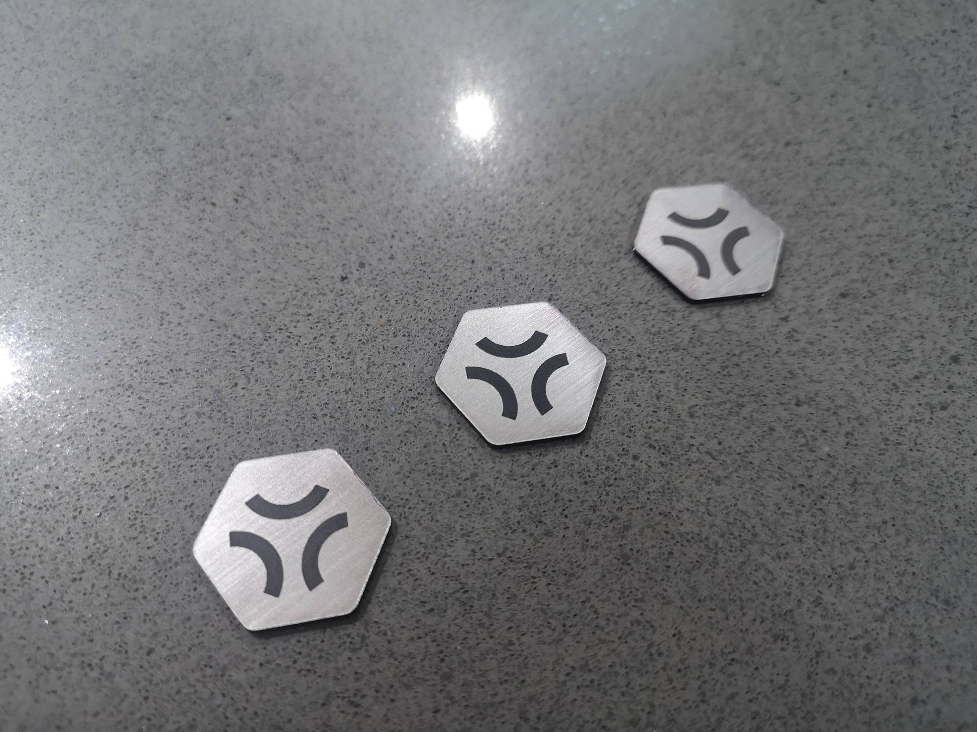Each token is made from a 2 colour acrylic with the designs engraved into the top layer.