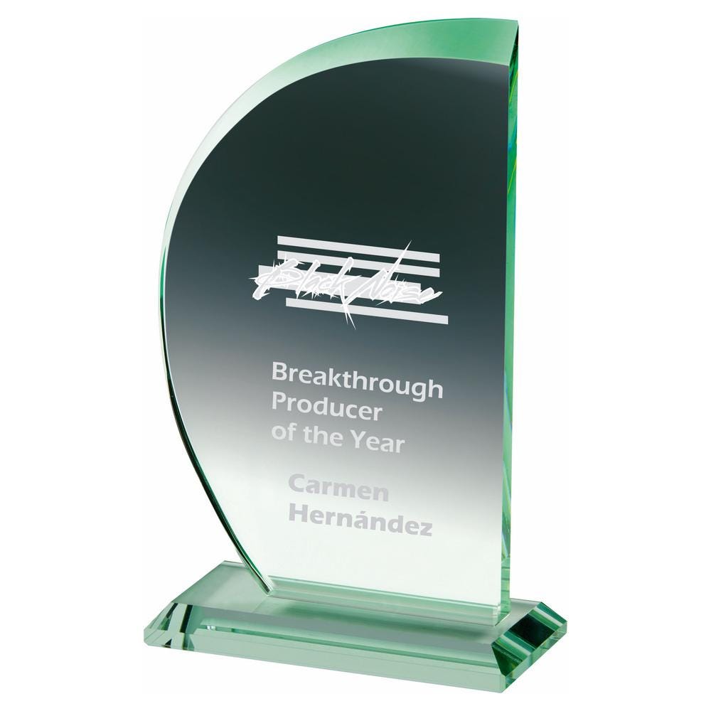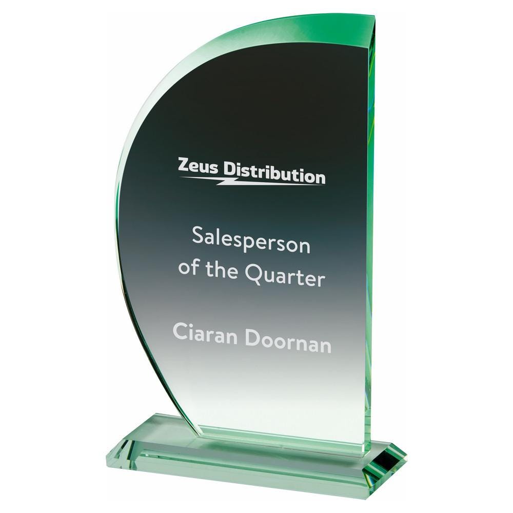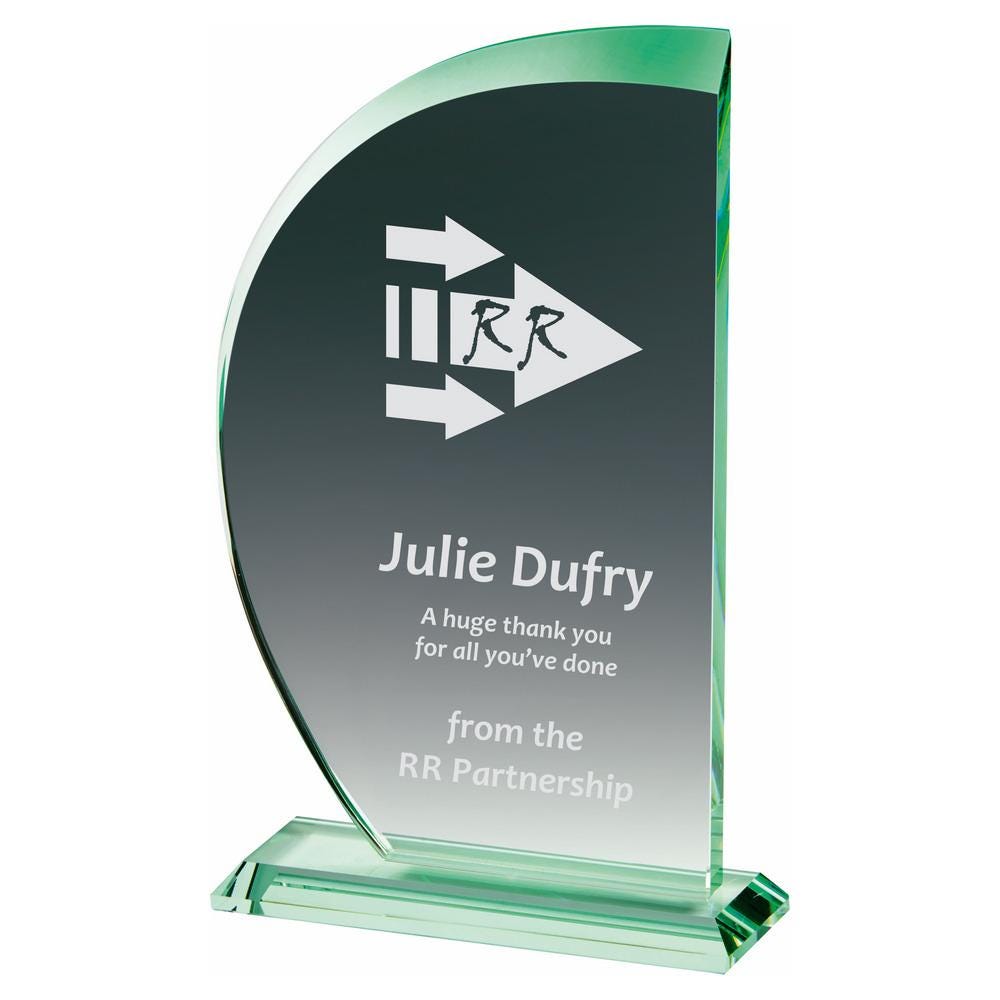 This listing is for a Jade Glass "Sail" Award, available in 3 sizes (18cm, 20.5cm, 23cm). Each award is 10mm thick glass and comes in a Presentation Case.