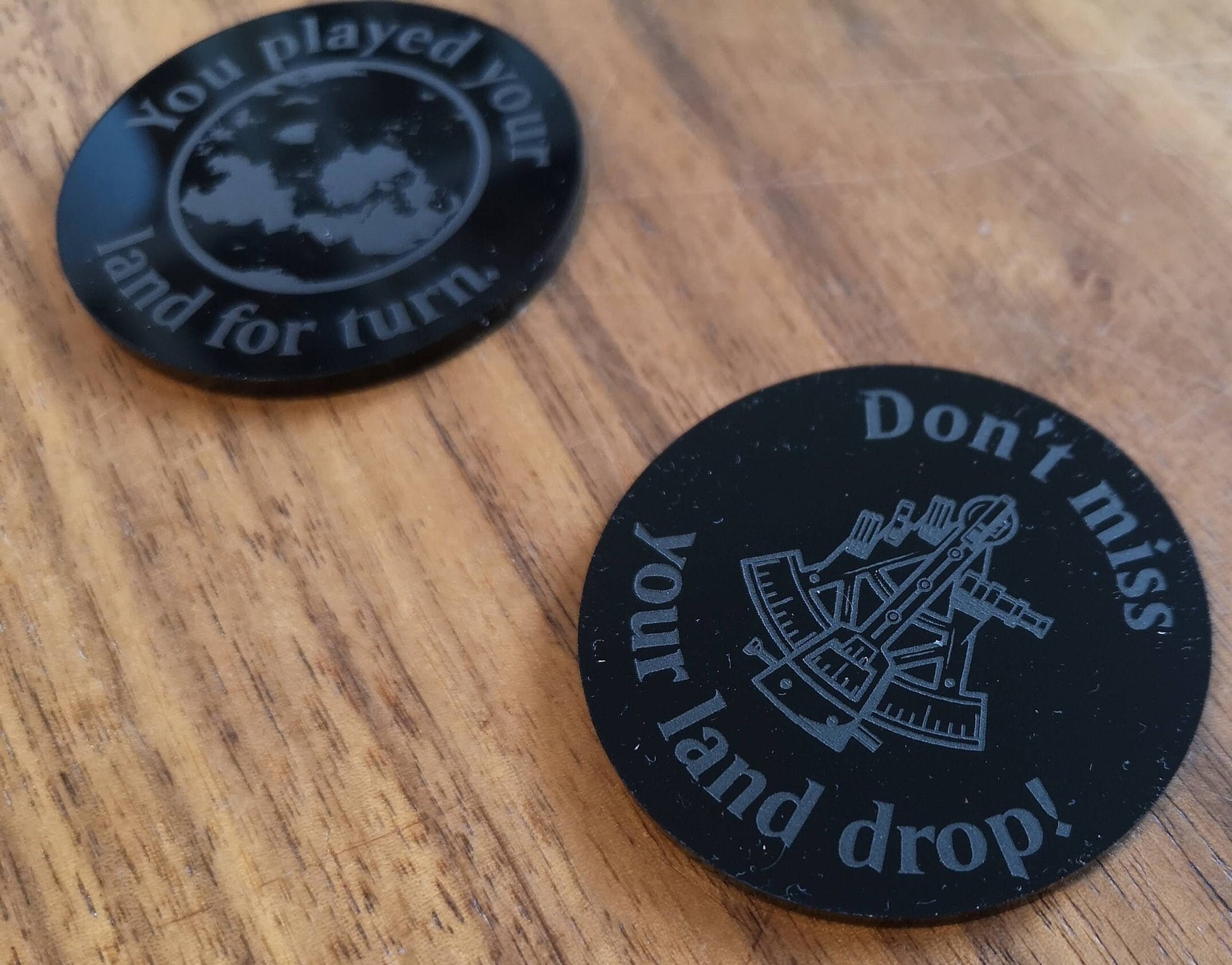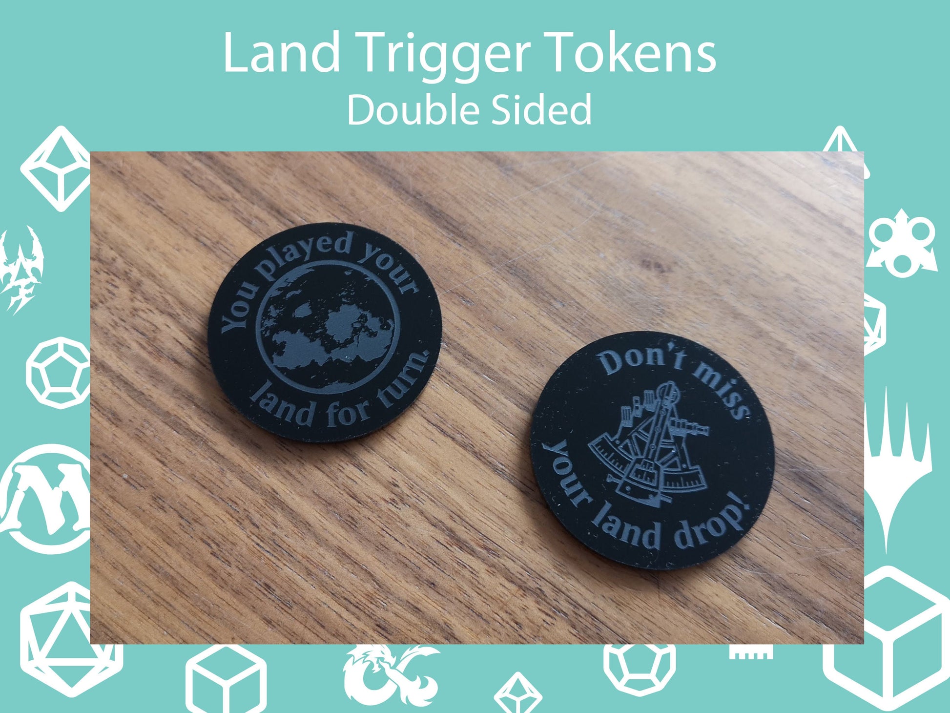 These Land Trigger Reminder tokens are ideal for Trading Card Games such as Magic the Gathering. No longer will you forget your Land Triggers with these on your cards. Each token has a 50mm, 2 inch(ish), diameter to make sure it is nice and visible on your card.