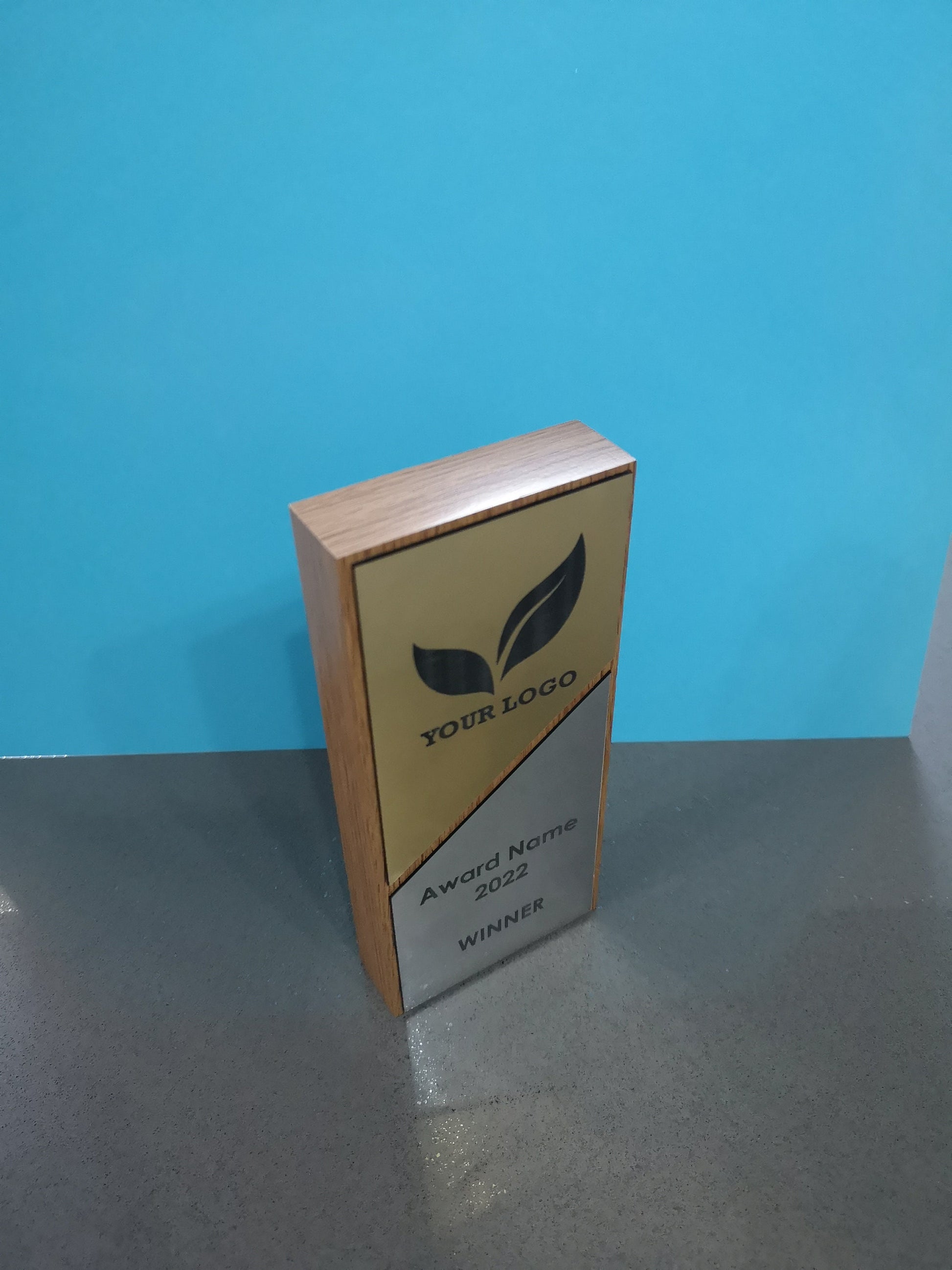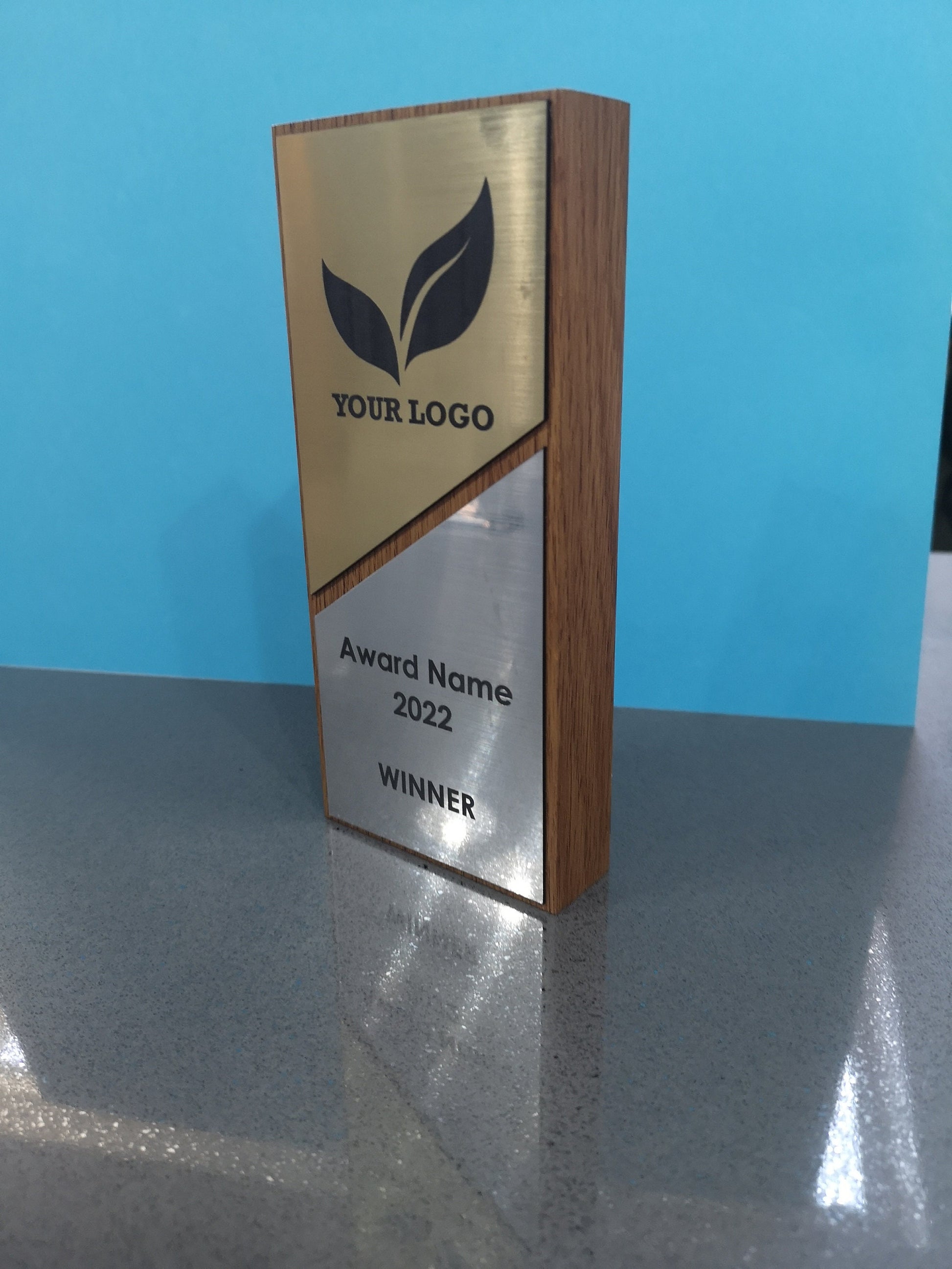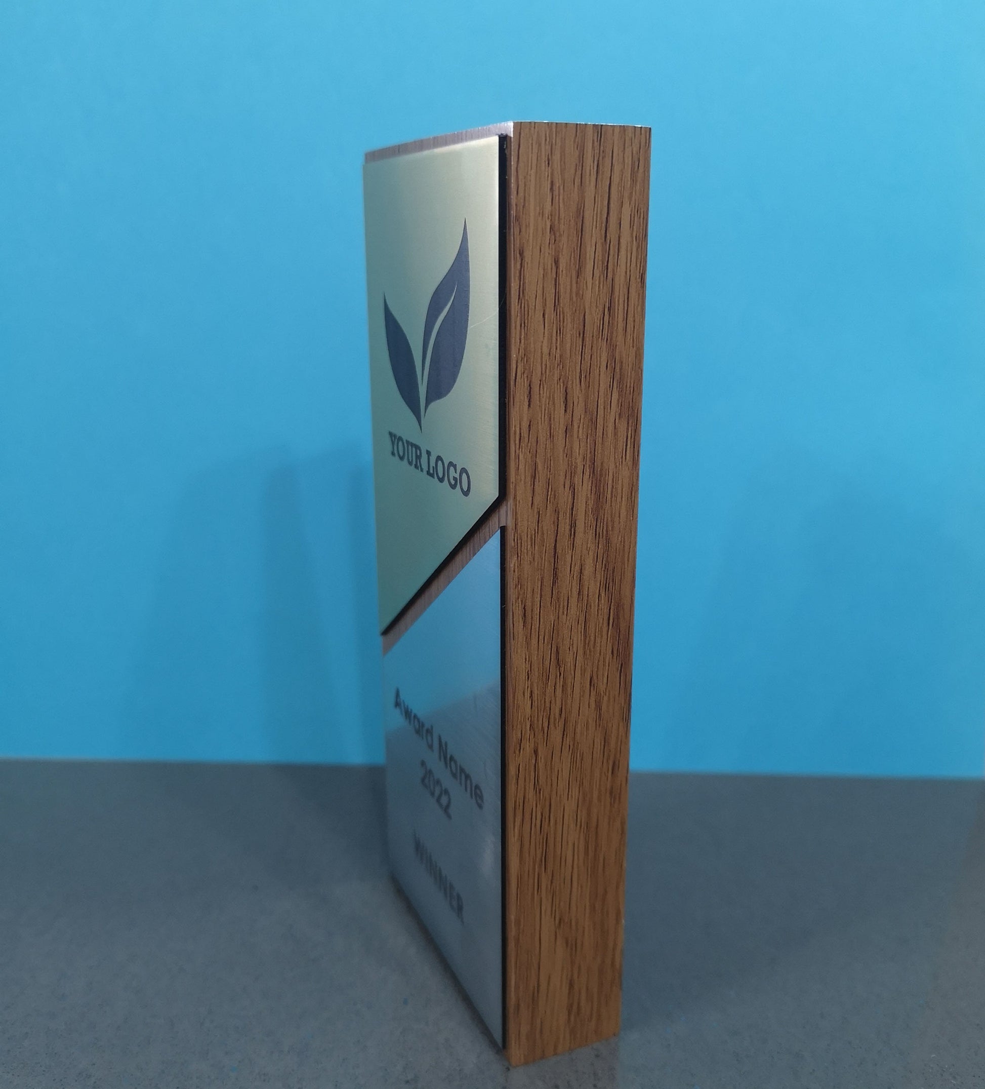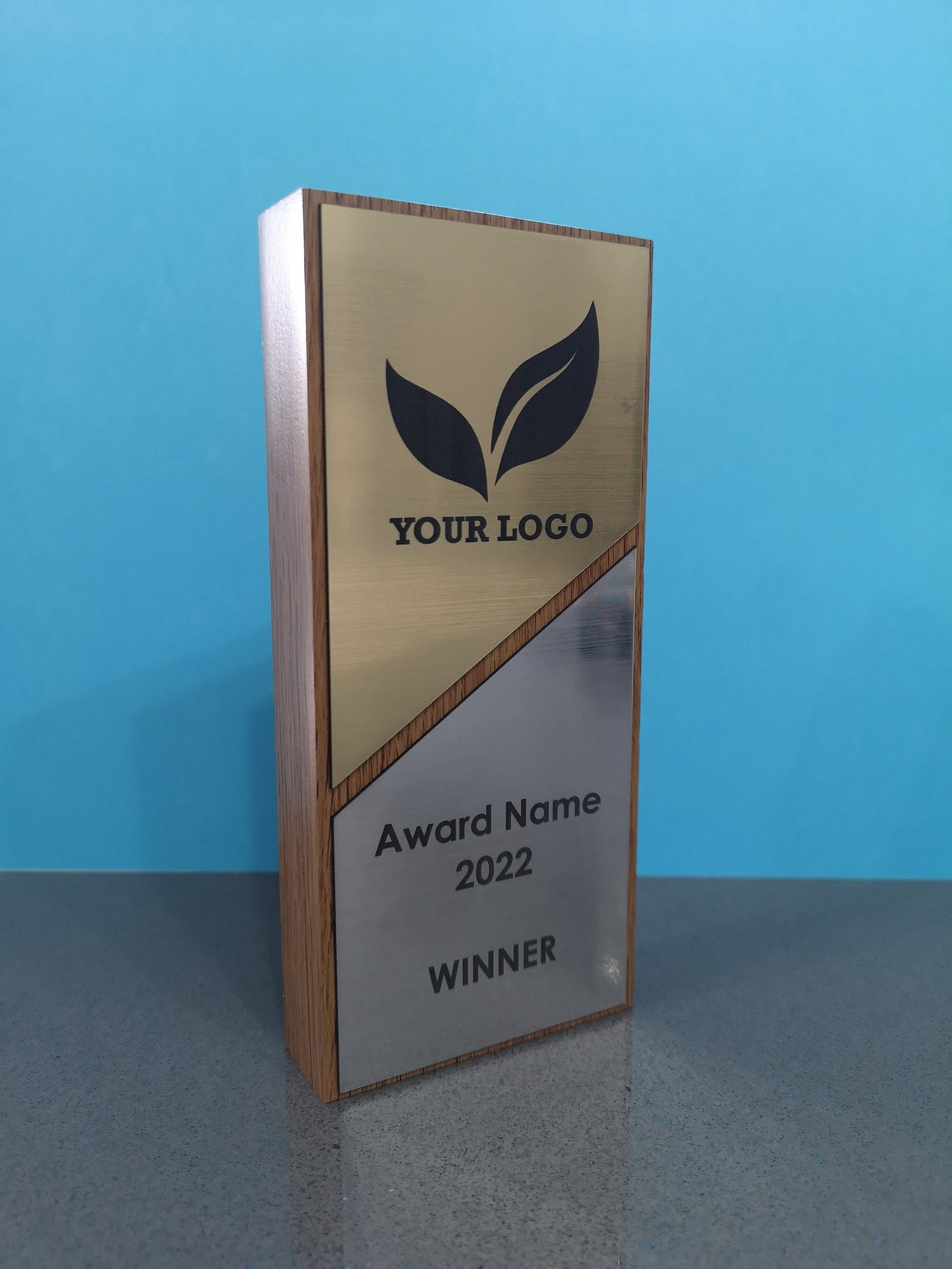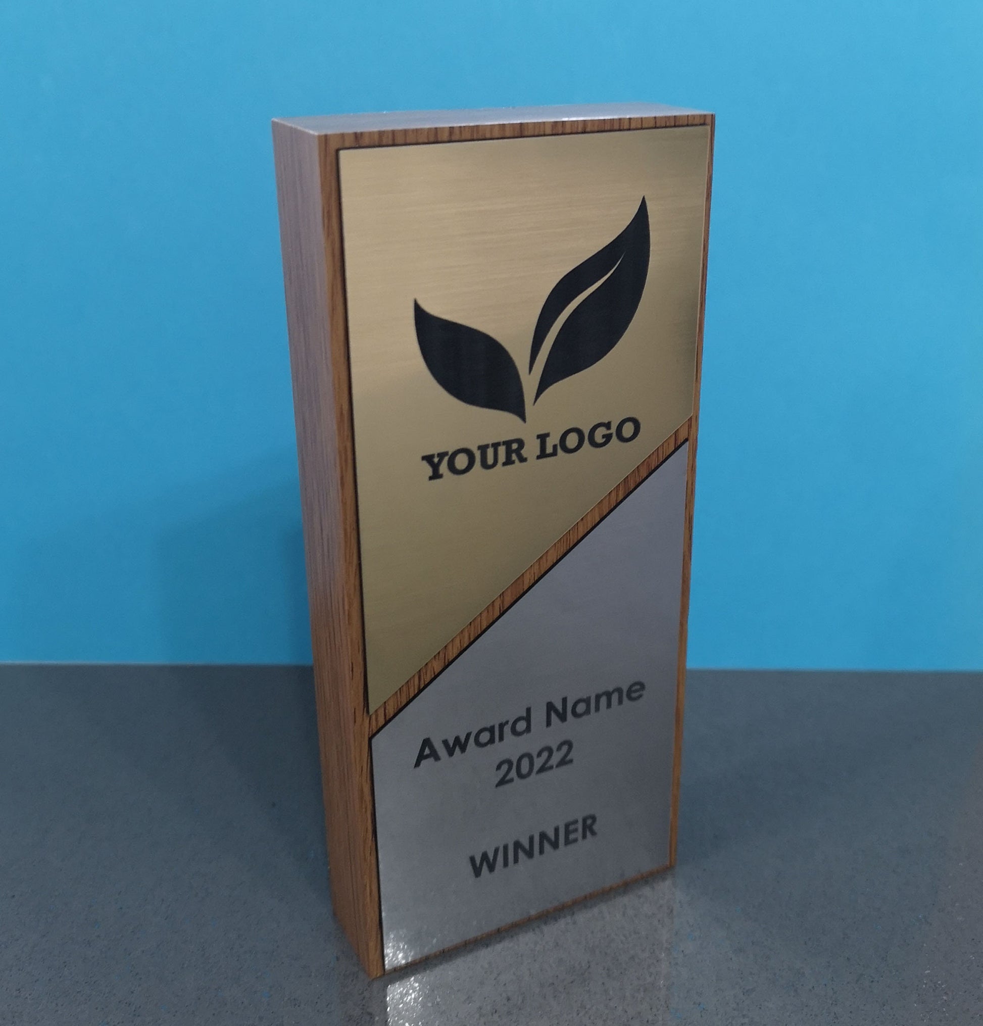 Light Oak Veneered wooden award with gold and silver 2-ply engraved acrylic.