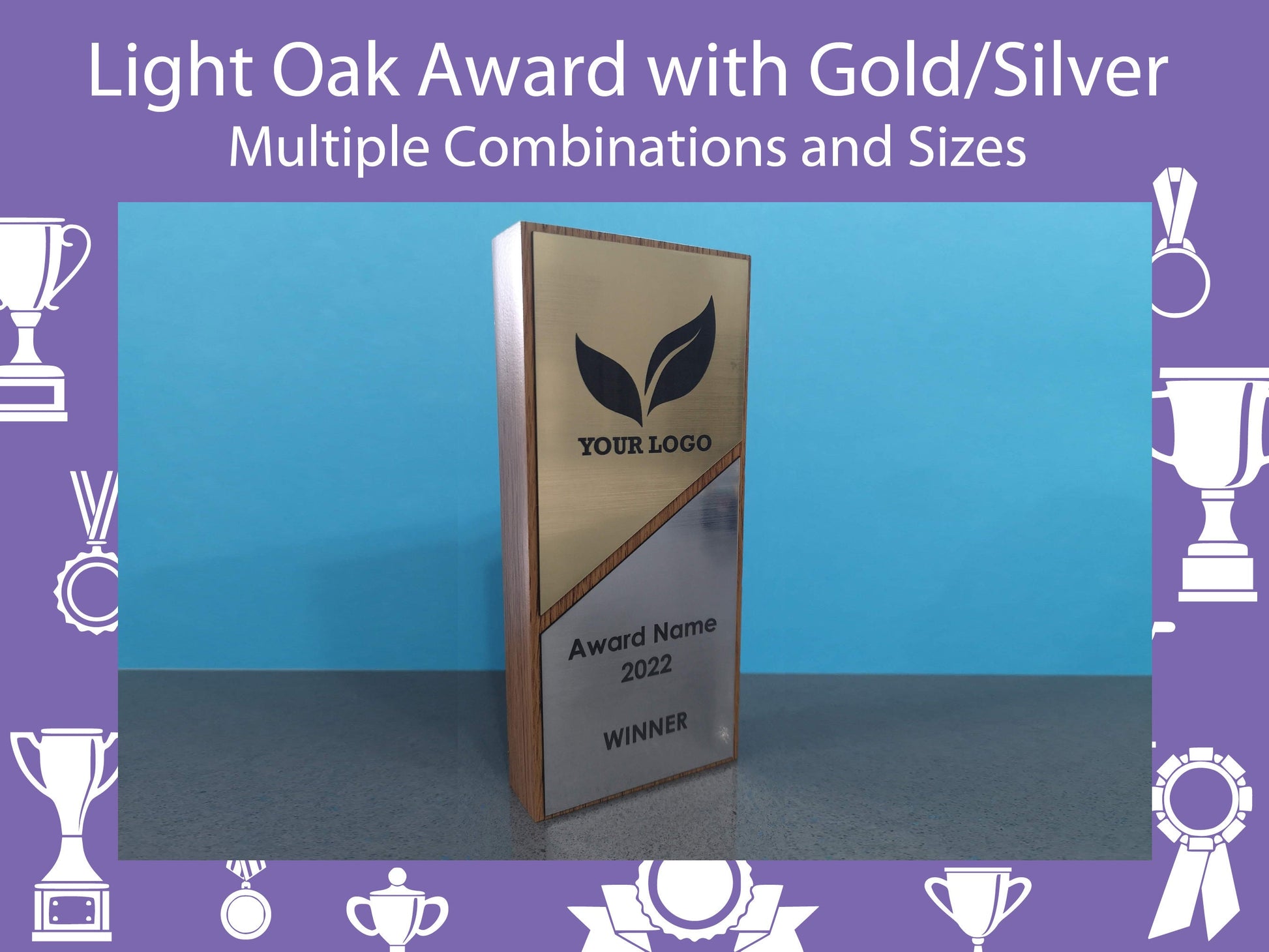 Each award is 8cm wide and 2.5cm thick, and are available in 3 heights: 16cm, 18cm and 20cm.