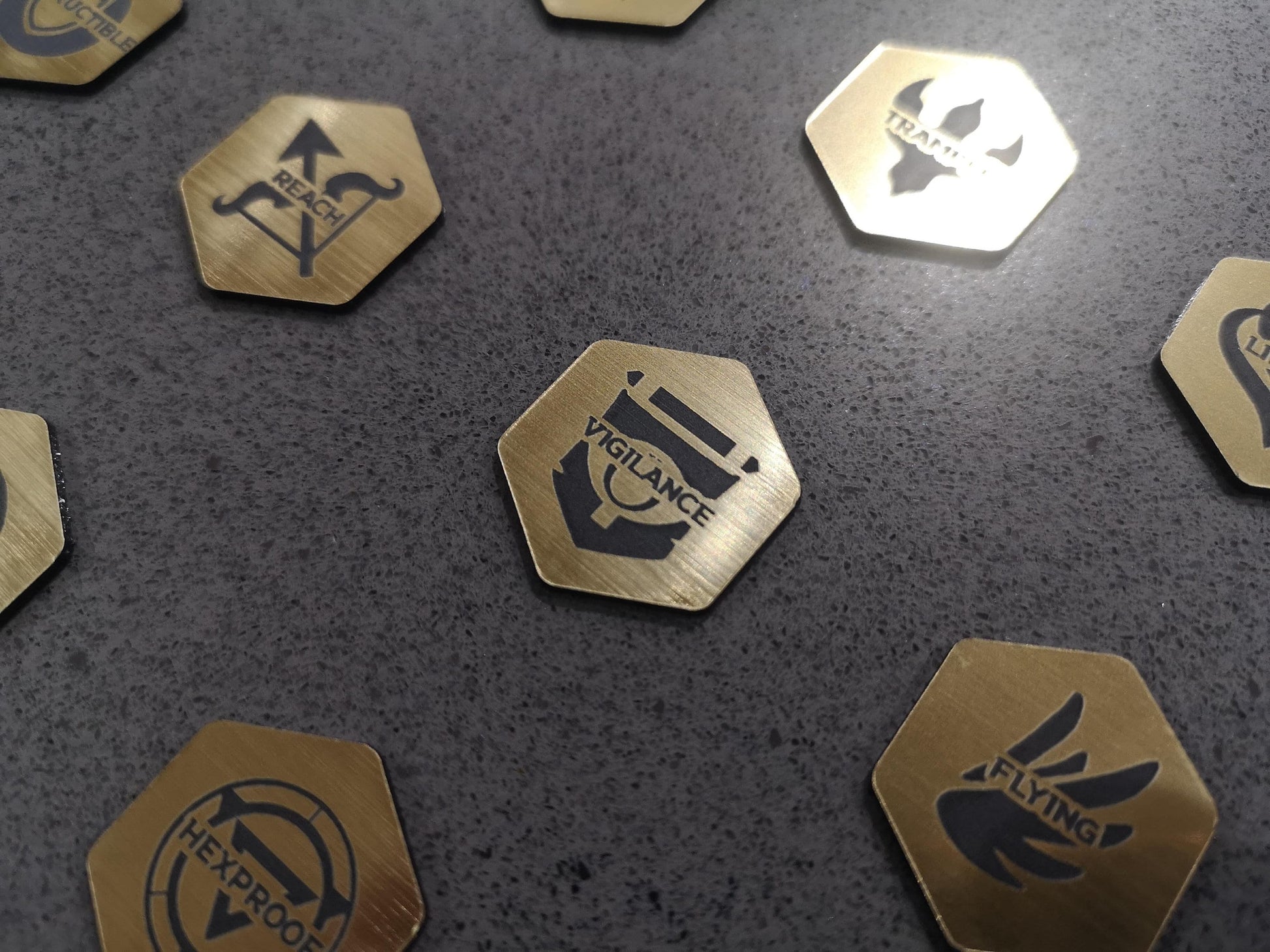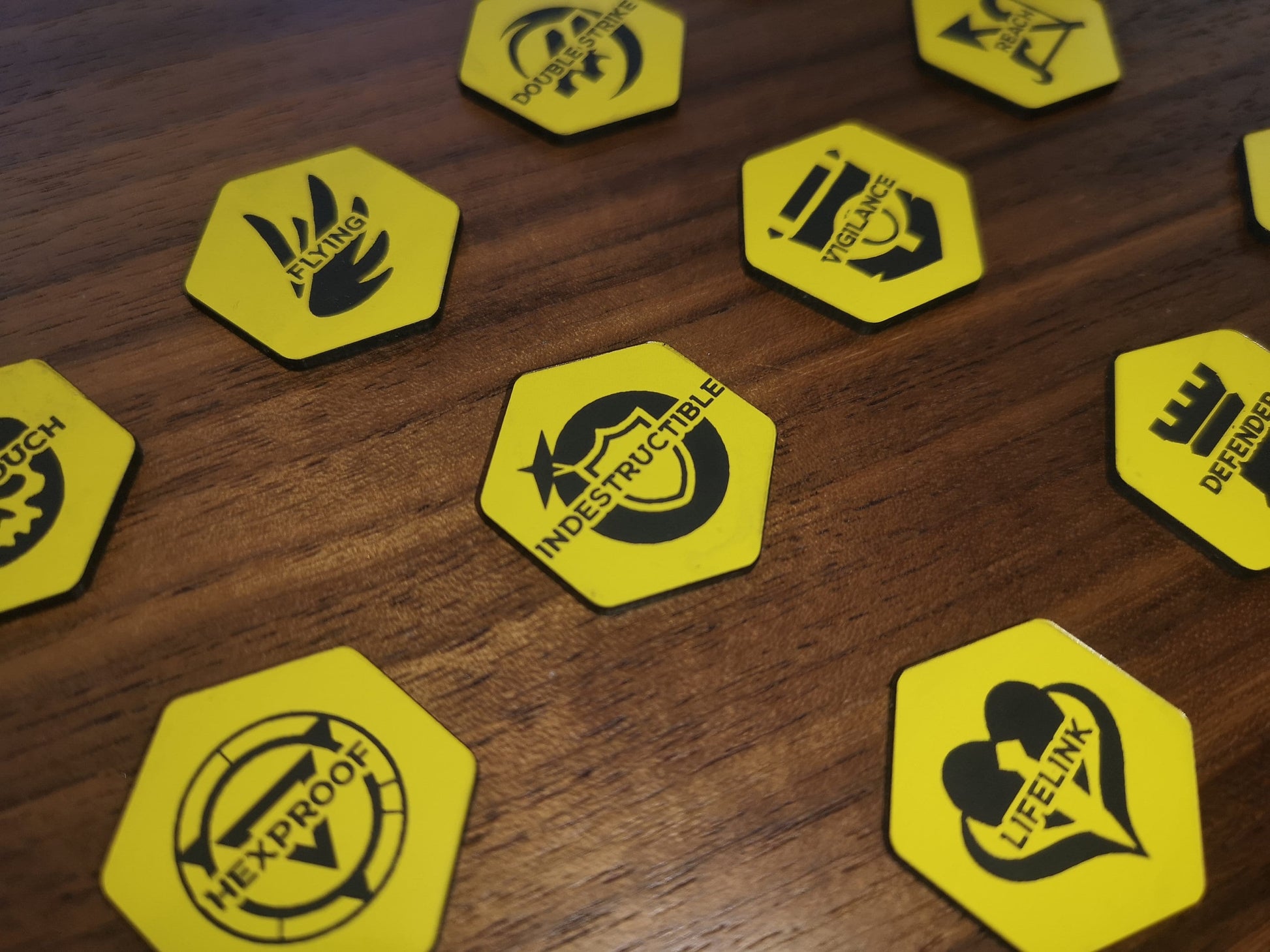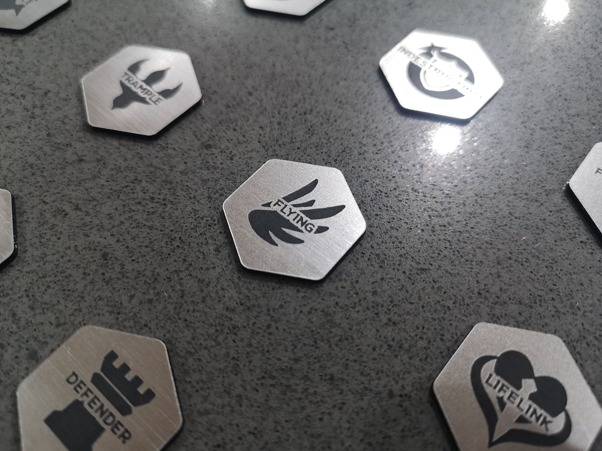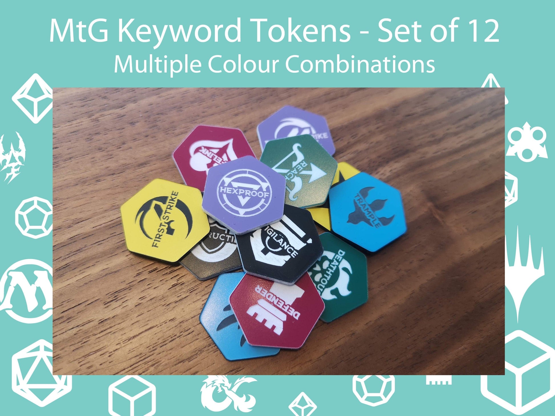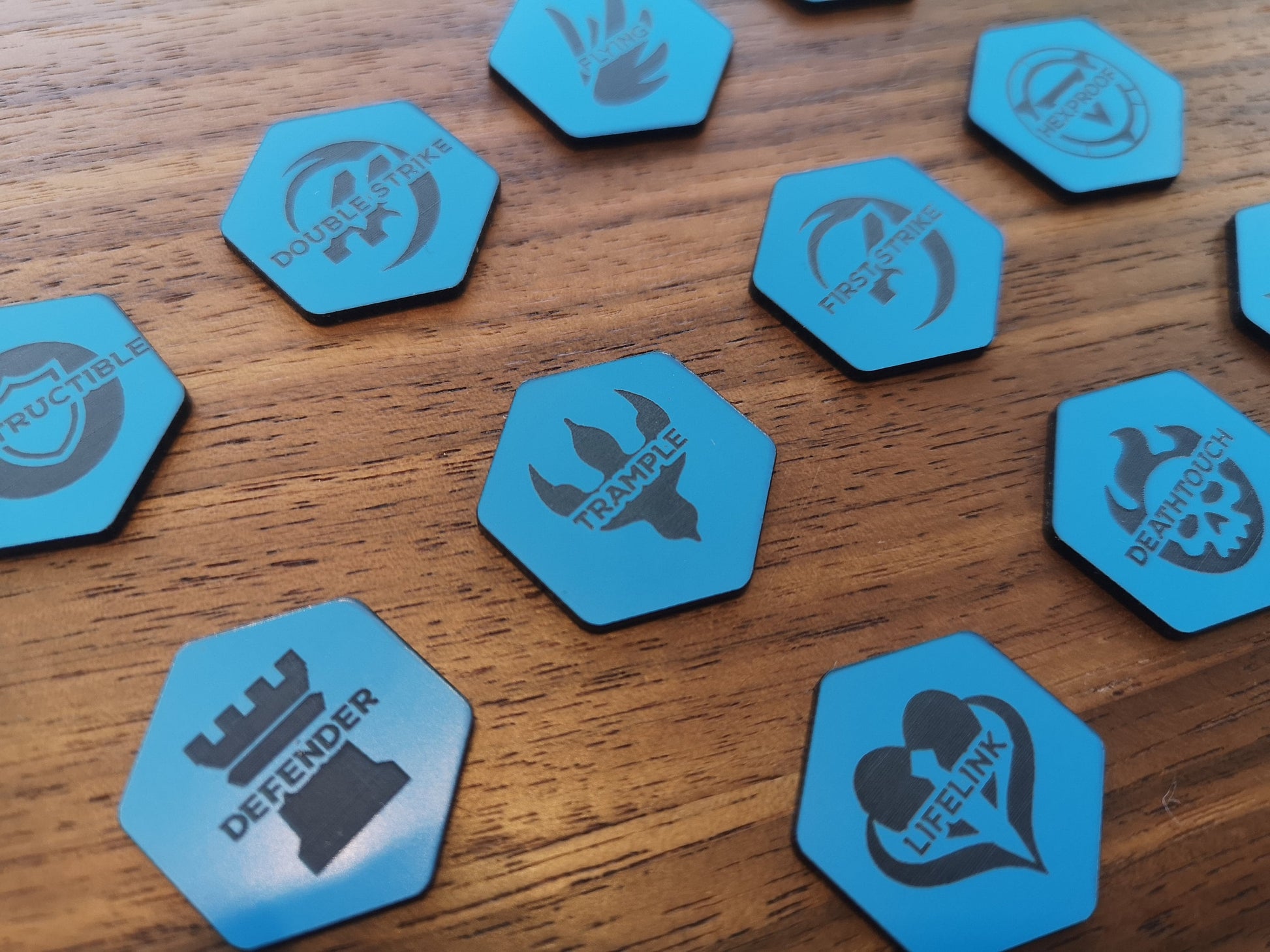 This listing is for a set of 12 laser engraved acrylic Magic the Gathering Keyword tokens. These MtG tokens are the ideal accessory for players, giving a visual aid for keeping track of card abilities. Useful for many variants of Magic the Gathering, such as Baldurs Gate, Commander or Streets of New Capenna.