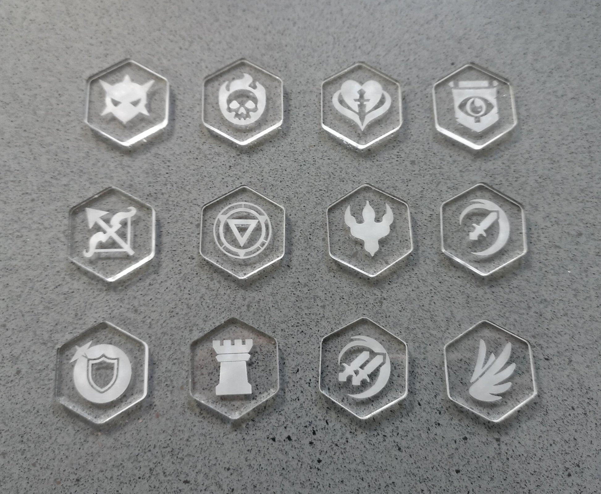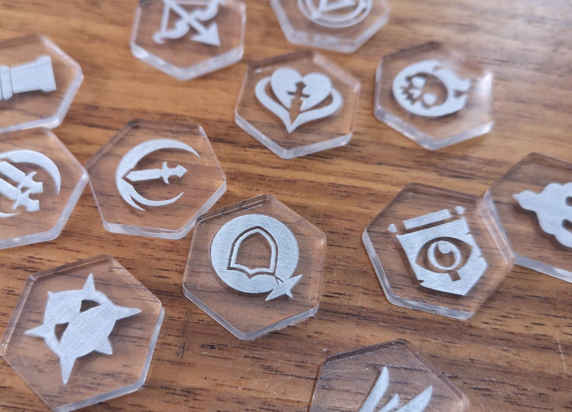 Each token is made from a clear or coloured acrylic with the designs engraved on. The designs can be infilled with gold or silver wax infill.
