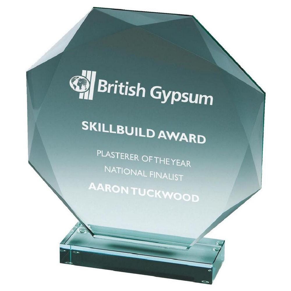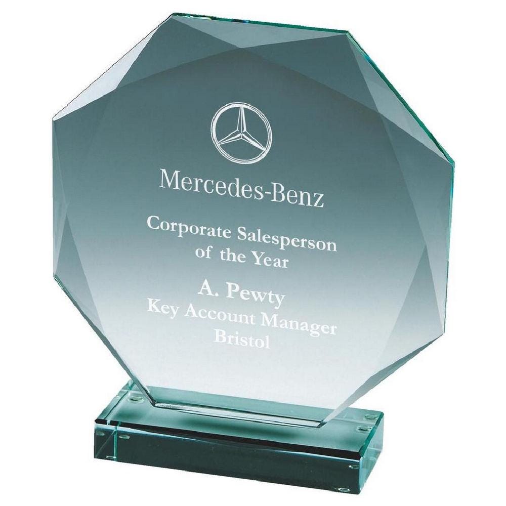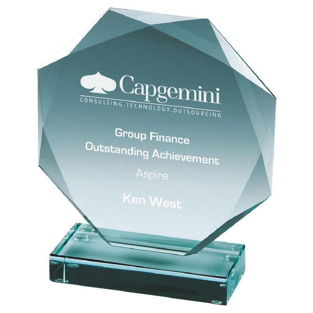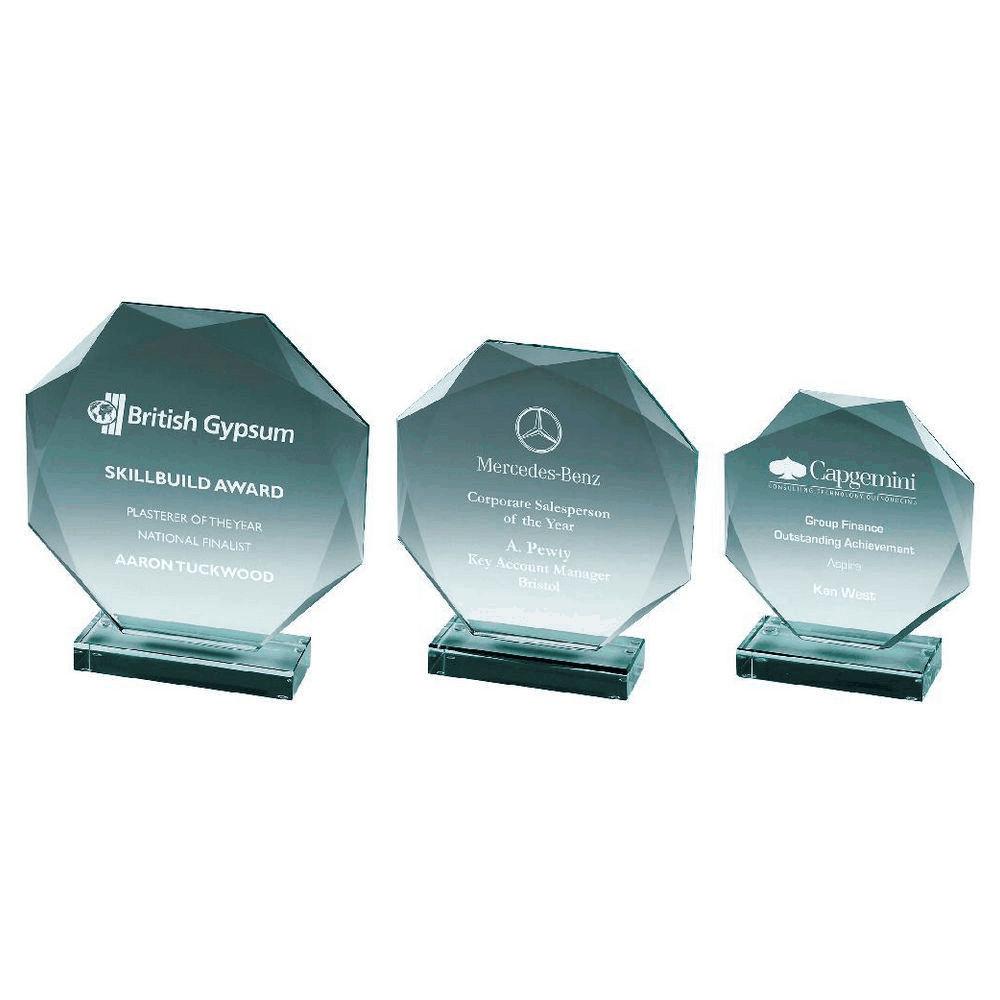 This listing is for a Premium Octagonal Jade Glass Stand , available in 3 sizes (17cm, 20cm, 22cm). Each award is 10mm thick glass and comes in a Presentation Case.