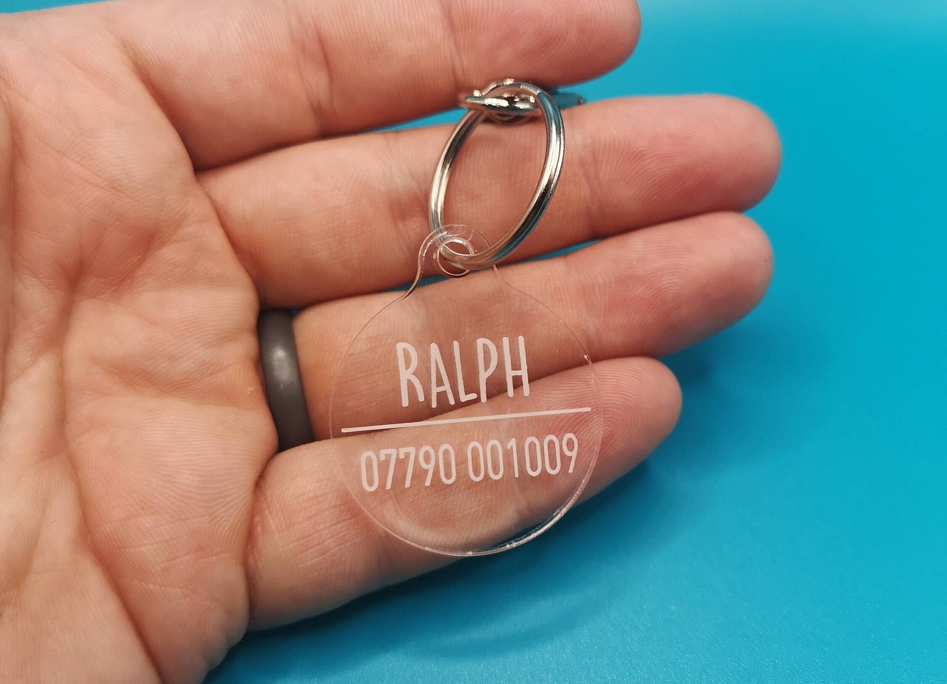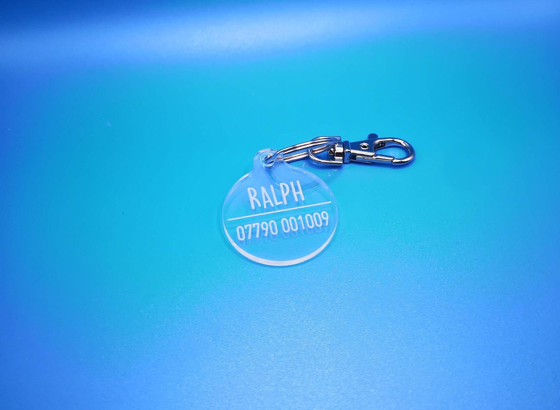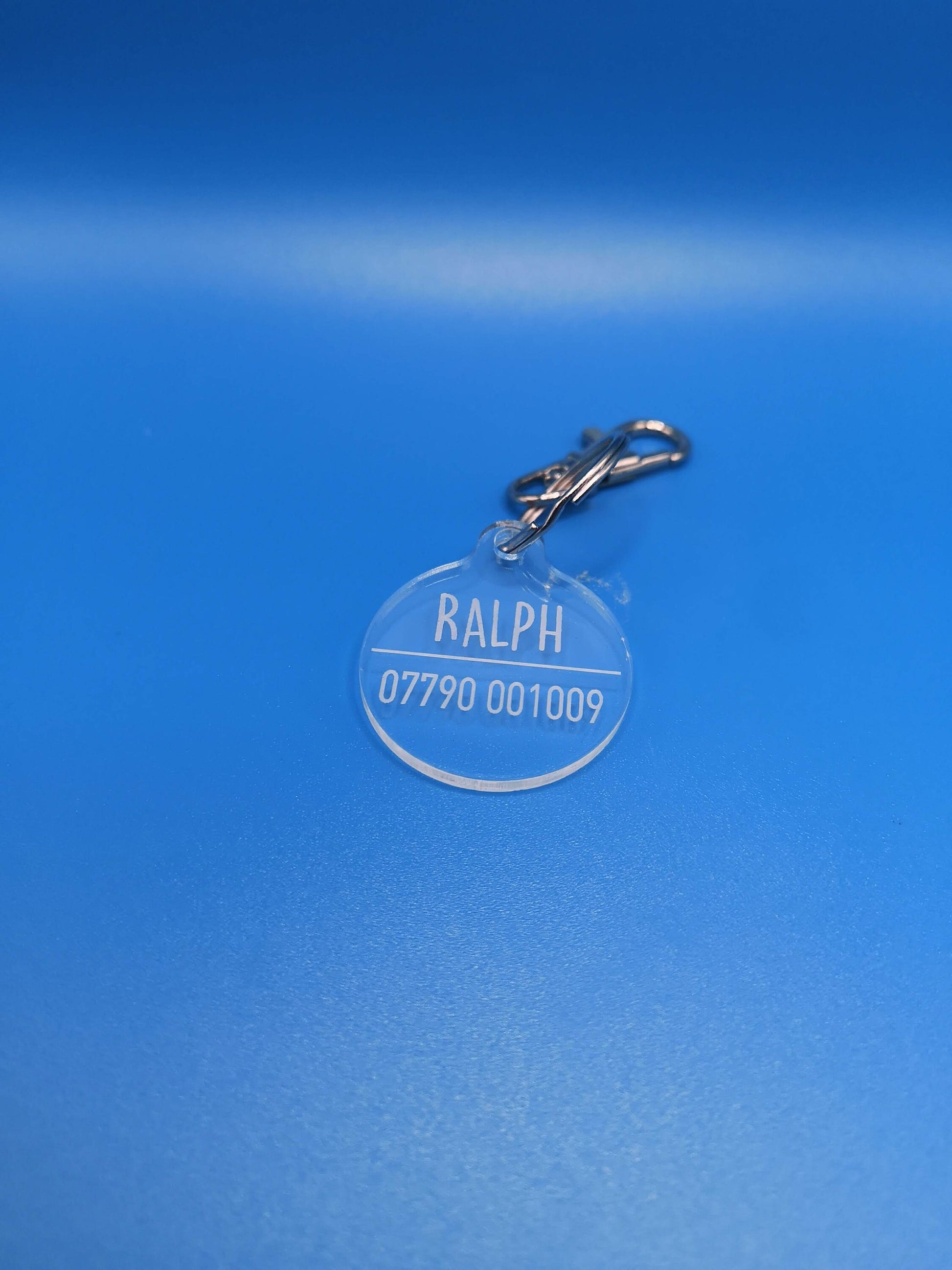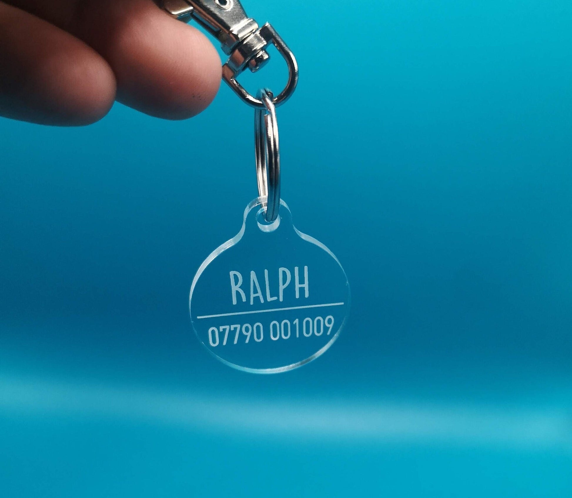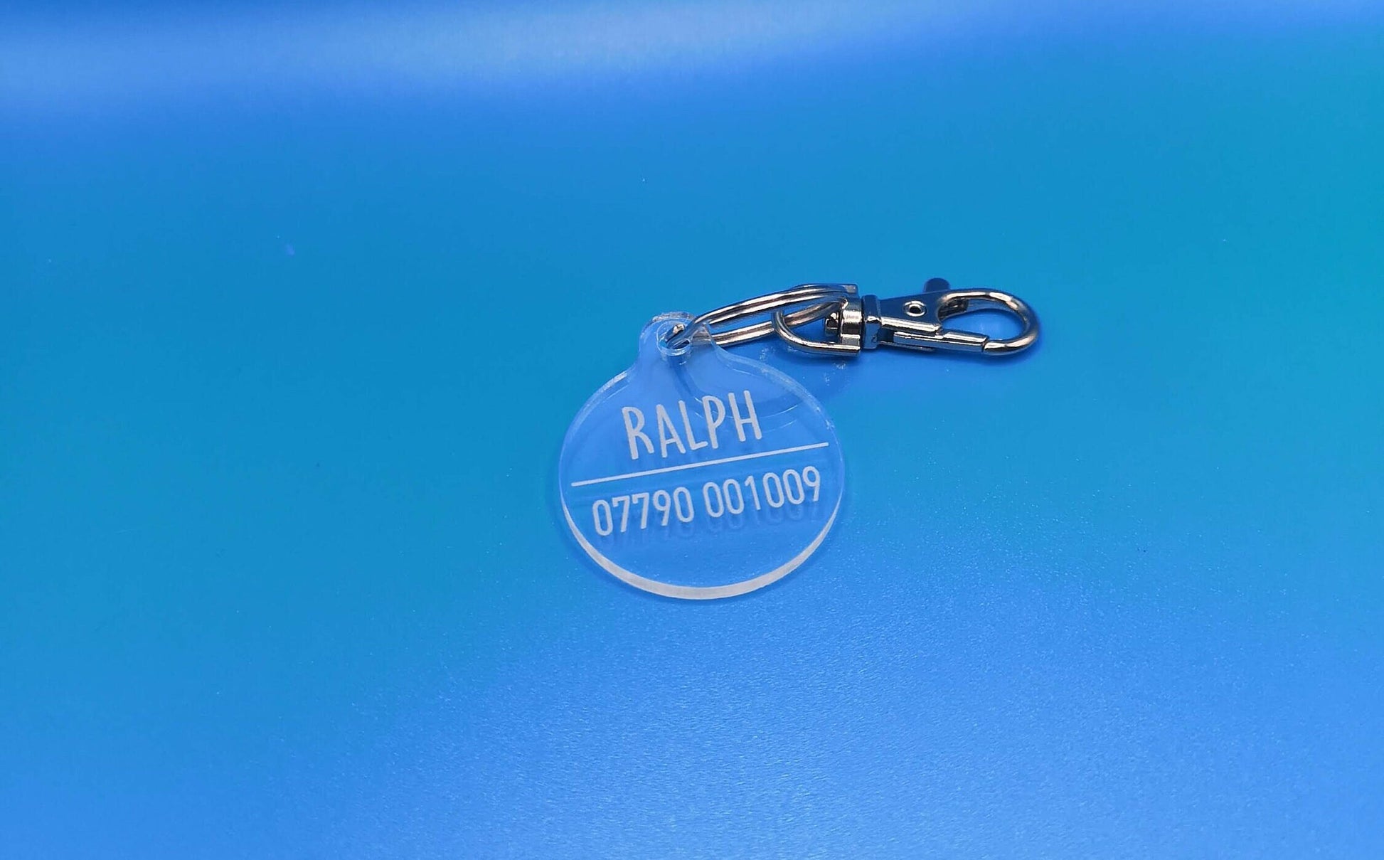 Each Pet ID tag is made from premium 3mm thick clear acrylic with your details of choice engraved onto the tag. Because the details are engraved, and not printed or transferred, they won't rub away or chip off.