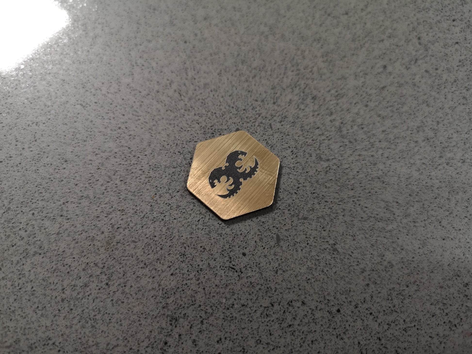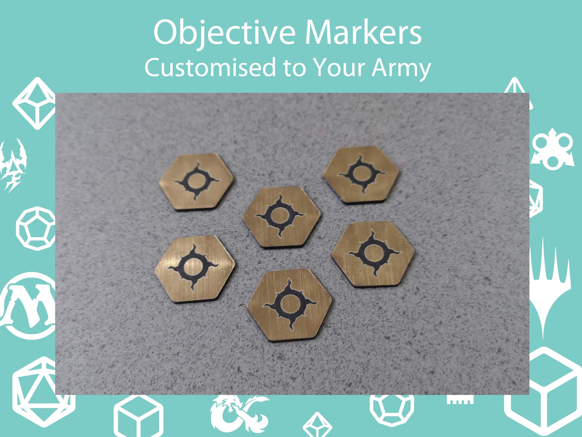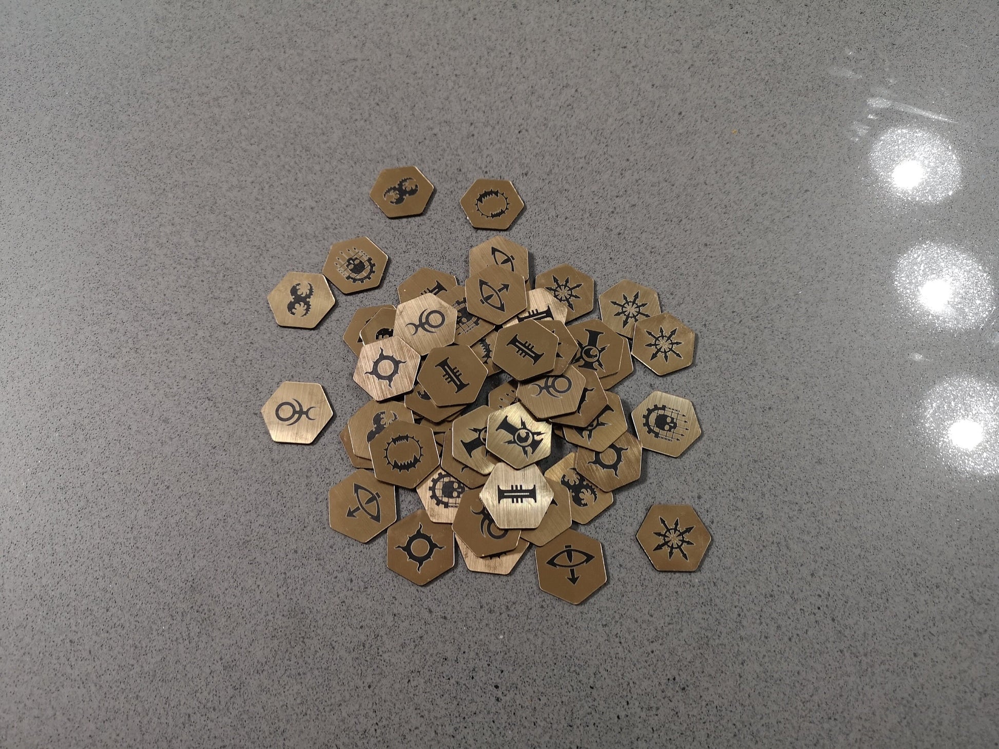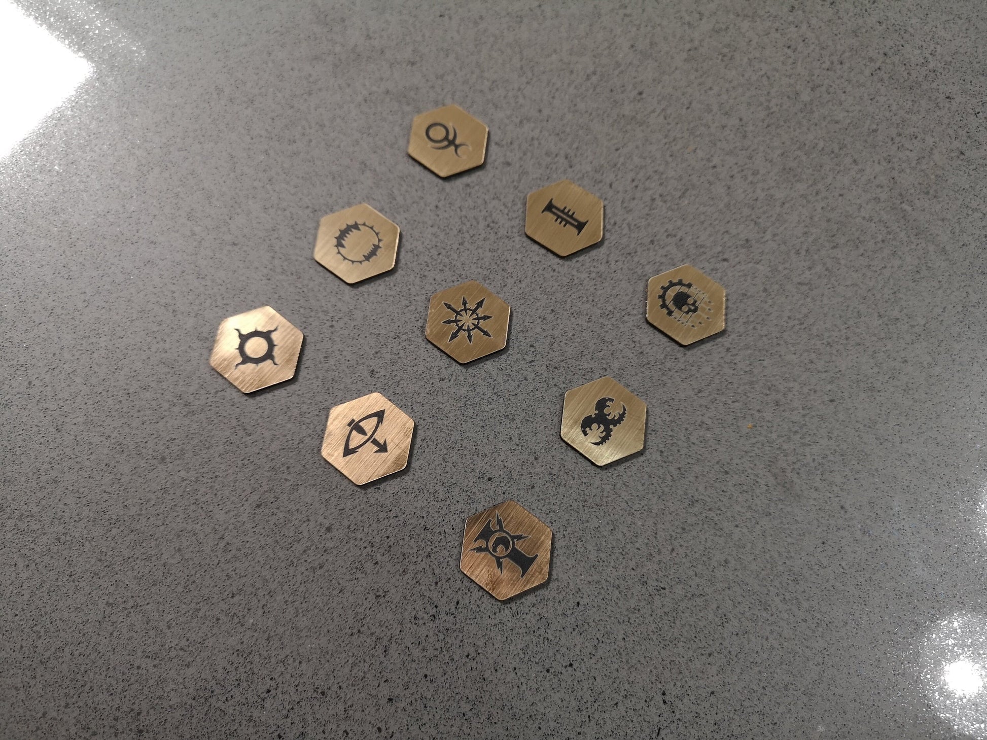 Each token is made from a 2 colour acrylic with the designs engraved into the top layer.