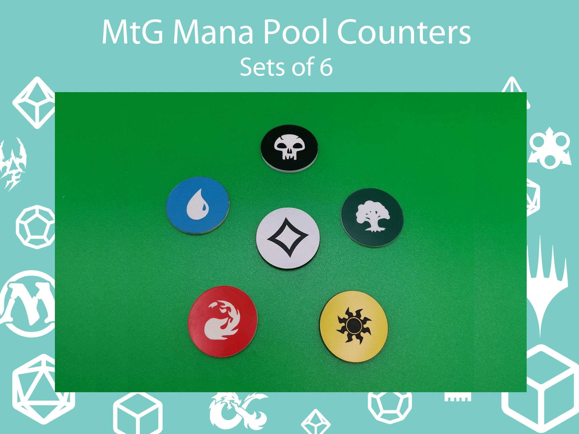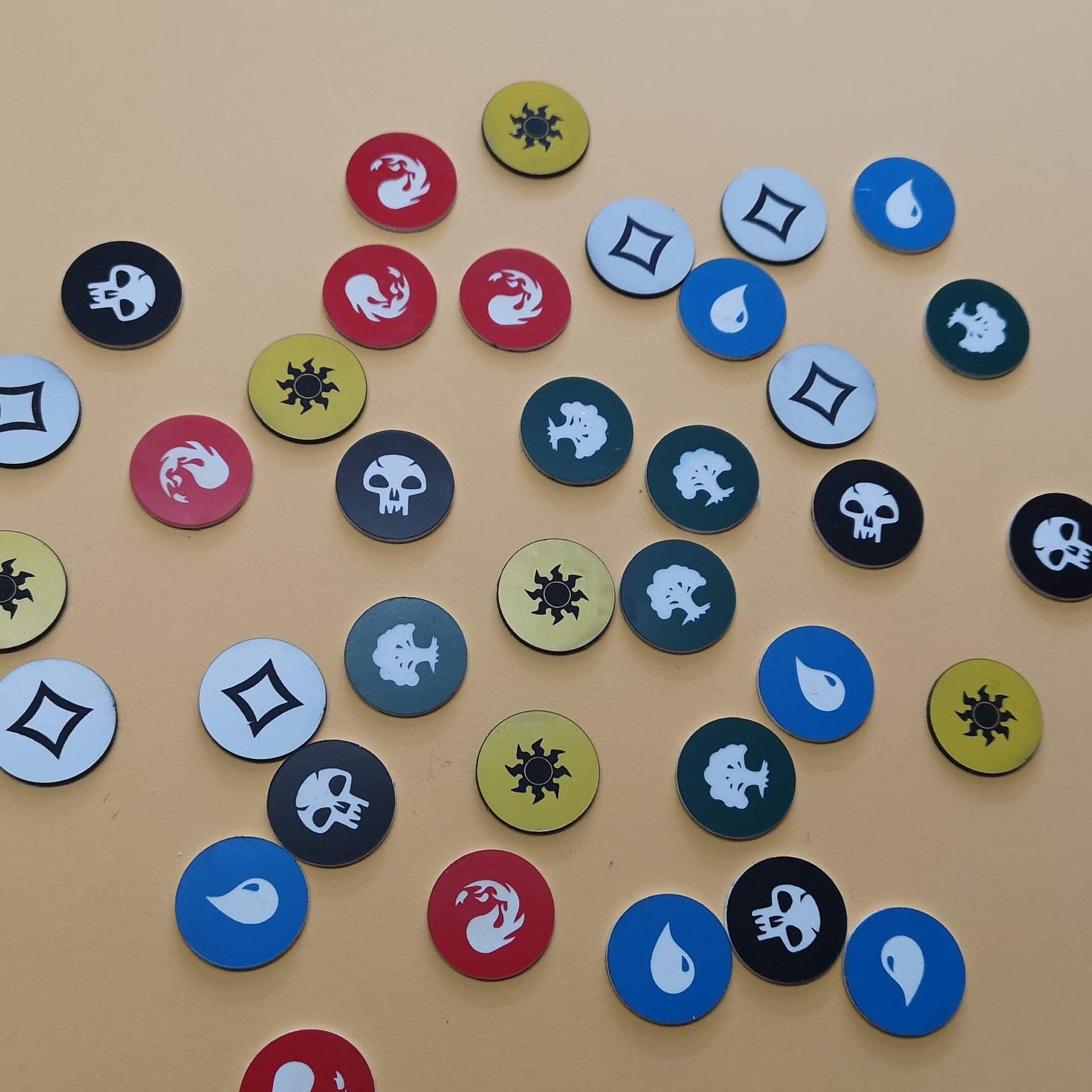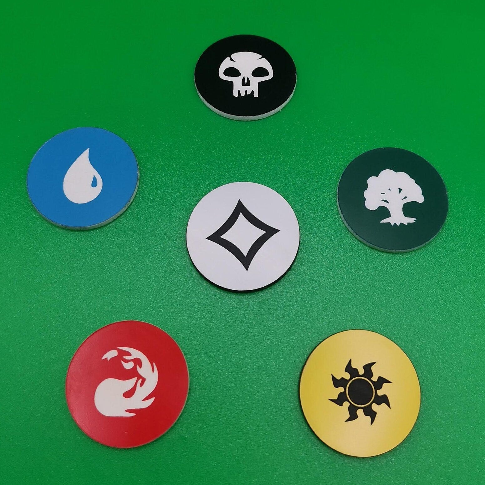 This listing is for a set of 6 laser engraved acrylic game tokens for playing Magic the Gathering. These are the ideal accessory for MtG players, giving a visual aid for any floating mana pools available.