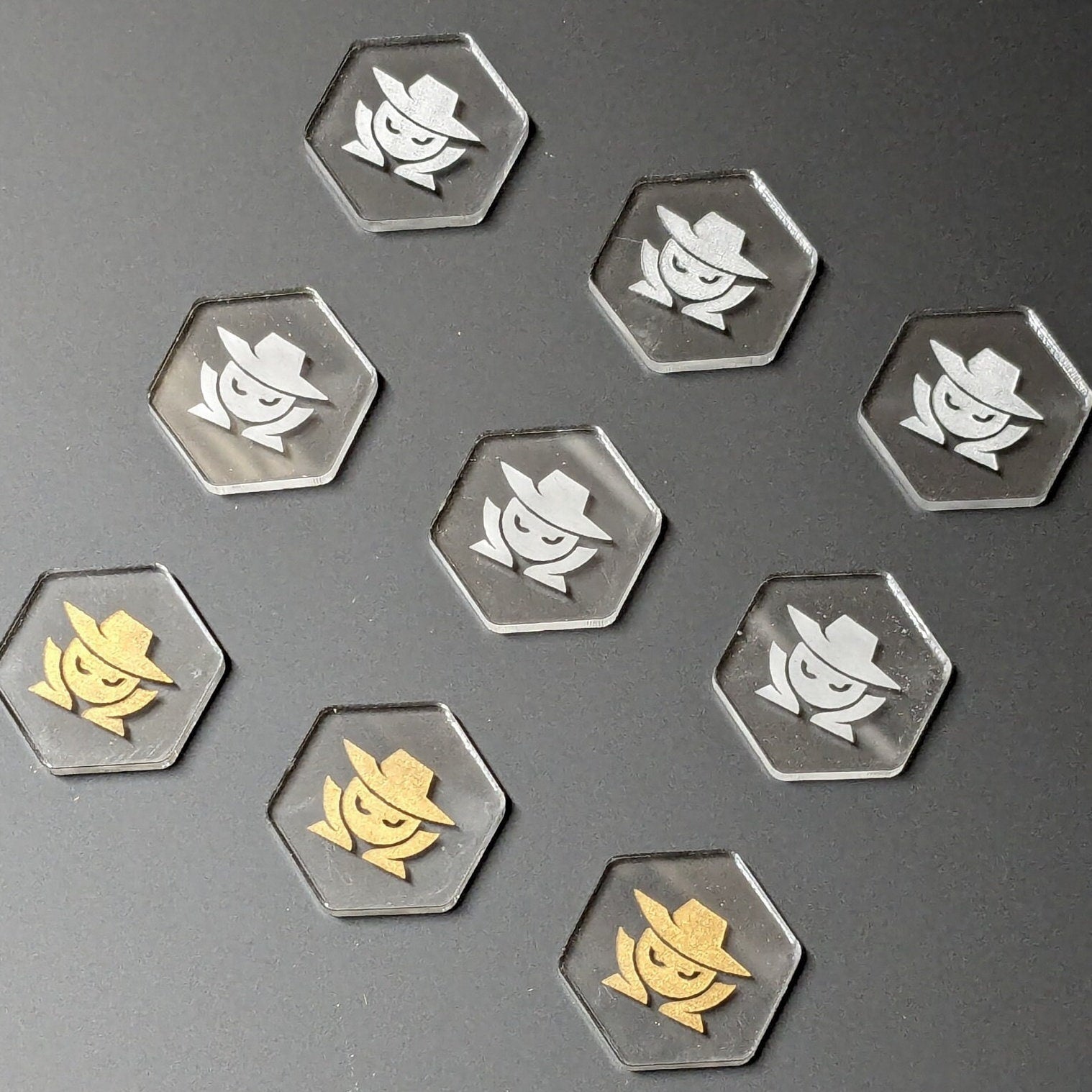 This listing is for a set of 3, 6 or 12 laser engraved acrylic Suspect tokens for playing Magic the Gathering. These are the ideal accessory for MtG players, giving a visual aid for keeping track of card abilities