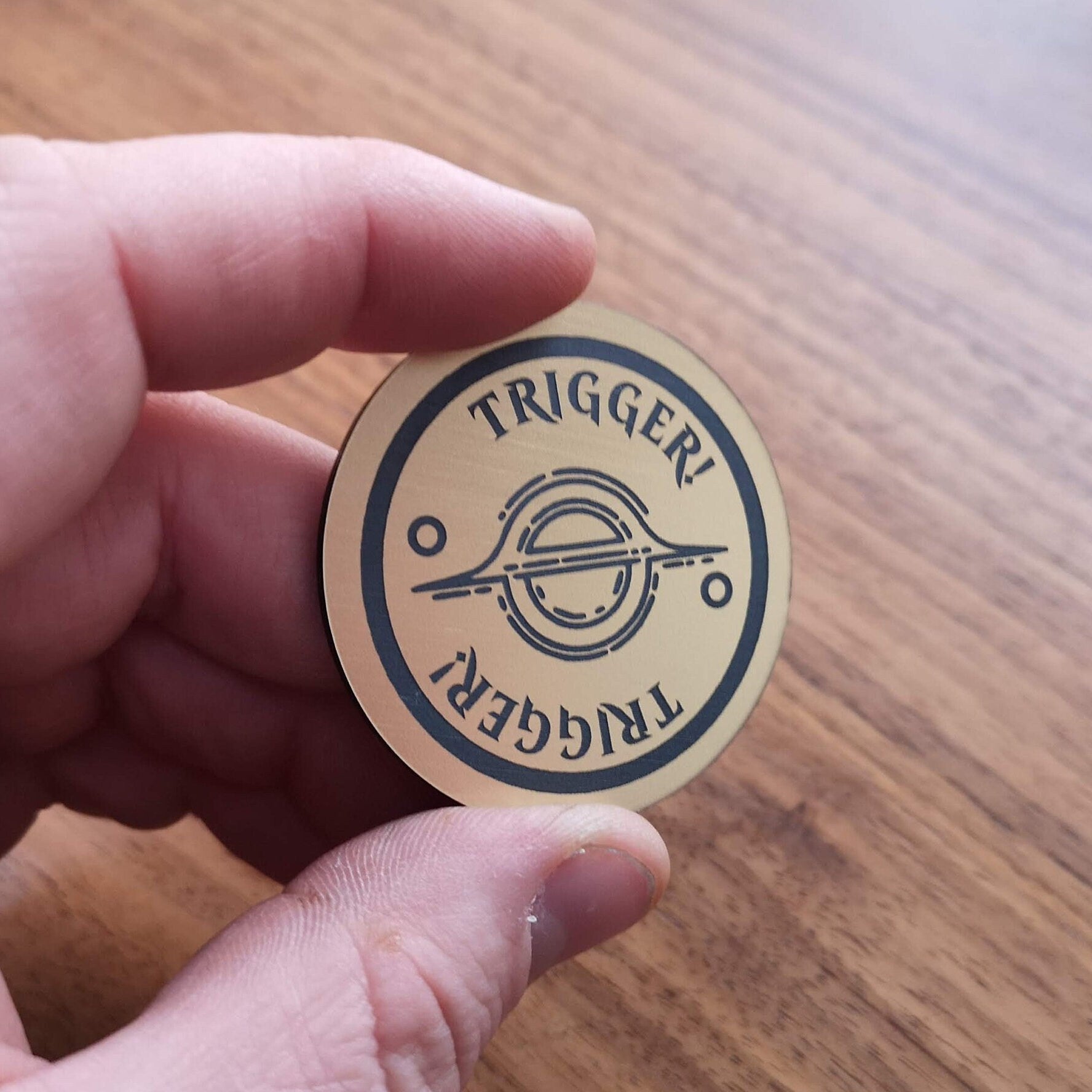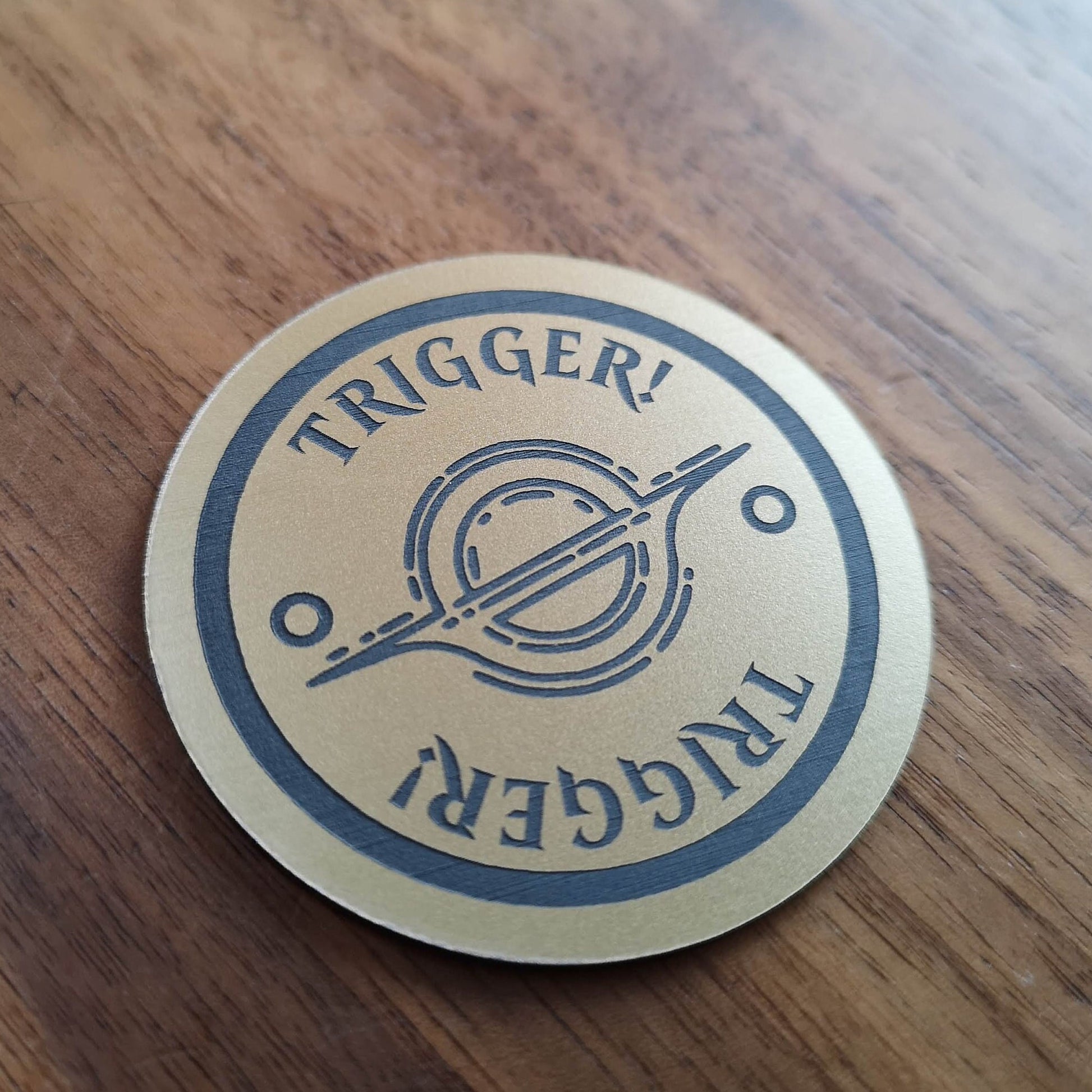 The Triggers tokens are made from 1.5mm (with a .2mm tolerance) thick 2-Ply acrylic and is engraved on the front of the token (these tokens can not be double sided).